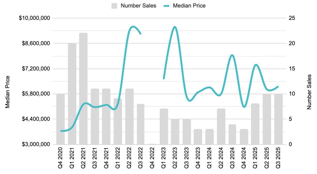 While sales were up 11% YoY, Median Pricing across the South County, at $1.9MM, remained flat as compared to Q3 2024 with modest changes in the percentage of sales across submarkets (aka mix shift). Compared to Q2 2025, Median Price increased a mild 4% (from $1.83MM). Since Q2 2024, Median Pricing has ranged from $1.8MM to $2MM, in stark contrast to the beginning of the past 5 year period (Q4 2020), where Median Price was $1.3MM, a 46% increase or +9% per year on average. Performance should always be more closely analyzed by submarket, however.