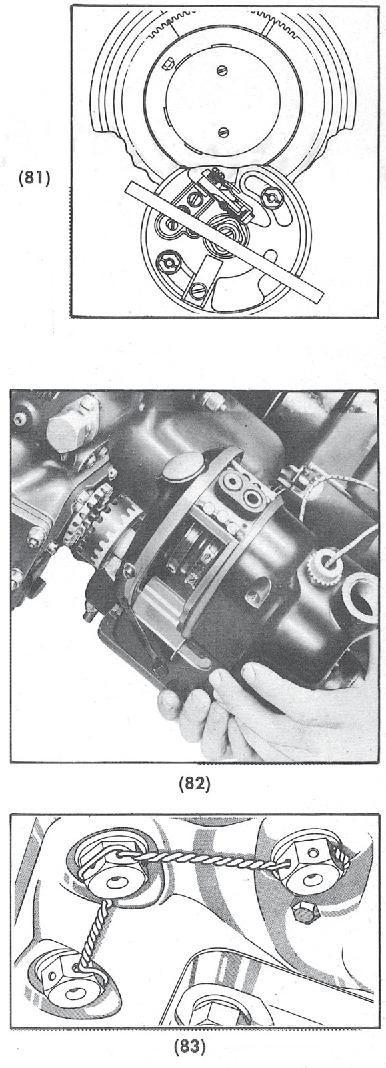 The magneto is then placed on the mounting pad, and a large drift is placed through one of the screw holes. An aft pull is exerted to compress the rubber drive and allow the magneto to slide down over dowel pins in the base. When this is completed, rotate the engine and check the point opening with piston location on the No. 1 cylinder. When the point opening coincides with the piston at 25 degrees BTC (before top center), insert the cap screws through the base and into the magneto. Complete the job by safety wiring the three screws together (83).