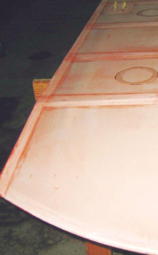 WOVEN POLYESTER FABRIC TENDS to unravel when it is cut dry, and the gluing process can be a real pain with threads and filaments pulling from the cut. To avoid this problem I use a process that coats the cut line with the first coat of filler material (in this case Poly-Brush), allowing it to dry, and then cutting with a good pair of scissors, razor blade, or knife. It works