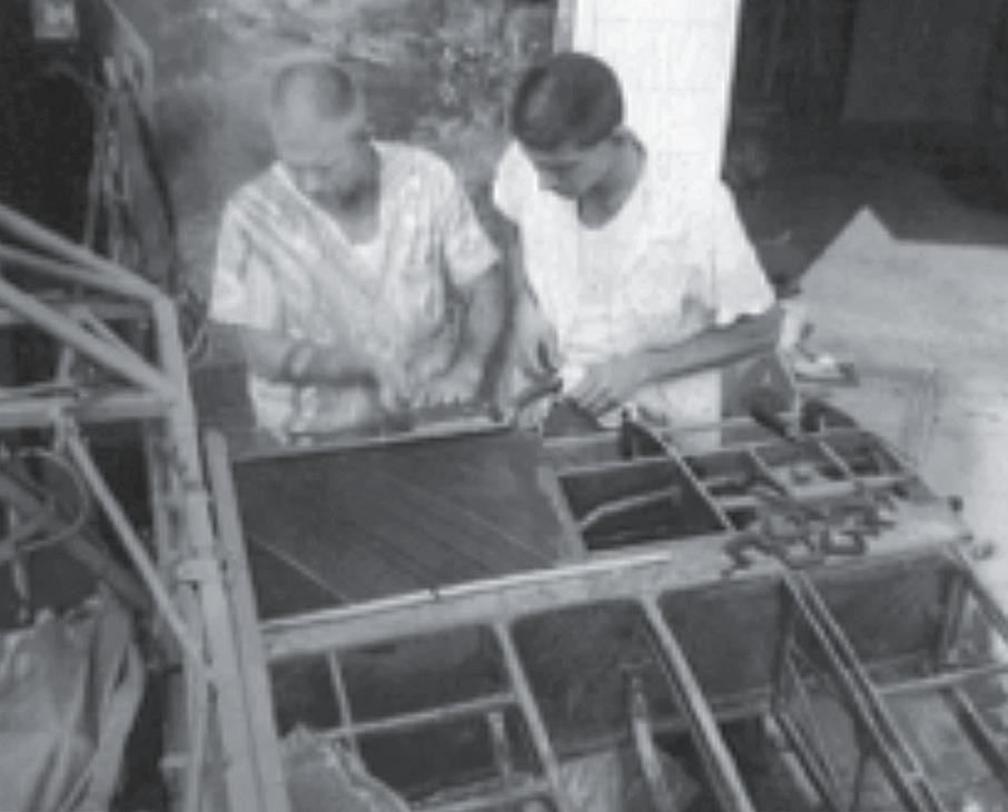 When forming of plywood is required, steaming is the best method; however, a steamer is not always handy. Soaking the plywood in hot water will aid in bending and forming the material. Figure 1 shows steaming 45-degree, 3/32-inch plywood around my Fairchild PT-19 center section leading edge back in 1958 when I was 19 years old. That is my late father, Leonard, to the left. He rented a wallpaper steamer, and it did a good job but was slow.