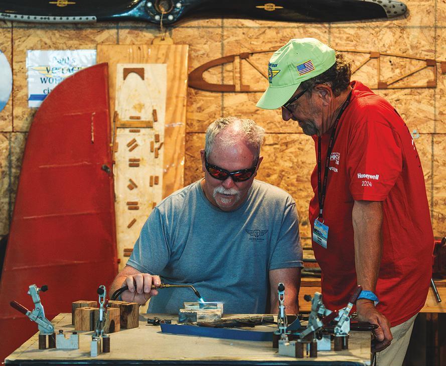AC has volunteered for several years with Dave Clark in the children’s hands-on workshops. Being an A&P mechanic and having a background in industrial arts education was a perfect fit. Sue grew up in an aviation family and decided to jump in when the workshop moved outside to the tent beside the hangar. We have enjoyed volunteering together in youth programs through the years, including directing the late Ron Alexander’s Youth Aviation Program in Georgia.