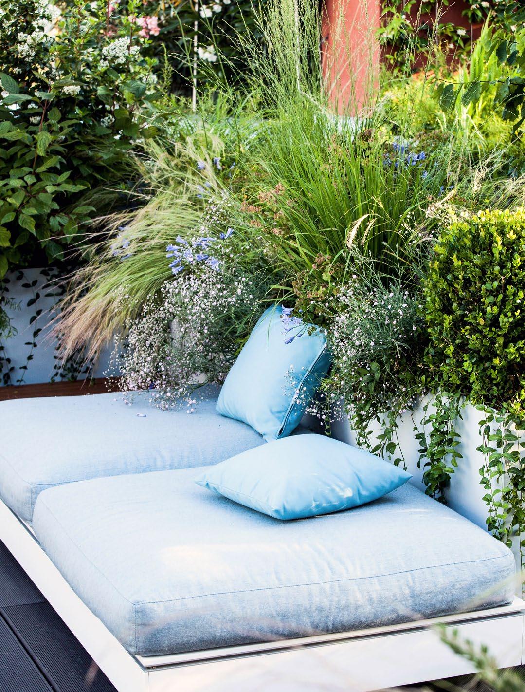 Gipskruid (Gypsophila) doet denken aan bruidsboeketten, maar is ook een verrassend mooie tuinplant. Het fijne, wolkachtige bloeiwerk combineert prachtig met siergrassen en weelderig groen. Gipskruid houdt van een zonnige, goed doorlatende plek en bloeit rijk. In deze loungehoek brengt het een gevoel van lichtheid en vrijheid, alsof je in een zomerse trouwsetting bent beland.