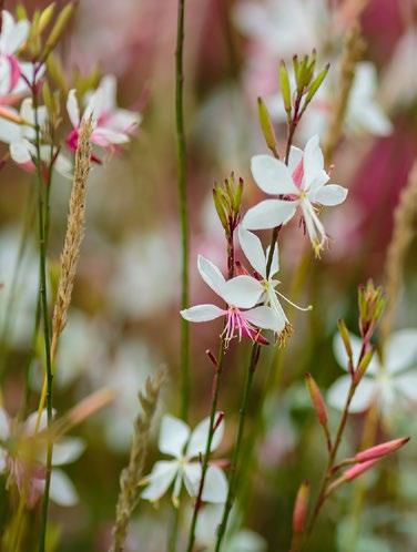 2 Gaura lindheimeri ‘Whirling Butterflies’ is een lichtvoetige plant met witroze, vlinderachtige bloemetjes die lijken te dansen in de wind. De stengels zijn slank en vertakt, waardoor de plant een luchtig effect geeft in je border. Hij bloeit langdurig en rijk, ook als het warm en droog is. Een onvermoeibare plant!