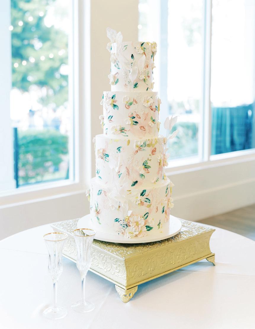 Also unforgettable were the cakes—including a four-tiered wedding cake with alternated layers of chocolate with mocha buttercream and hazelnut praline spread, vanilla bean with strawberry jam and strawberry Swiss buttercream, and blueberry lemon with lemon buttercream and lemon curd, adorned with palette knife florals with beading and edible pearl dusting.