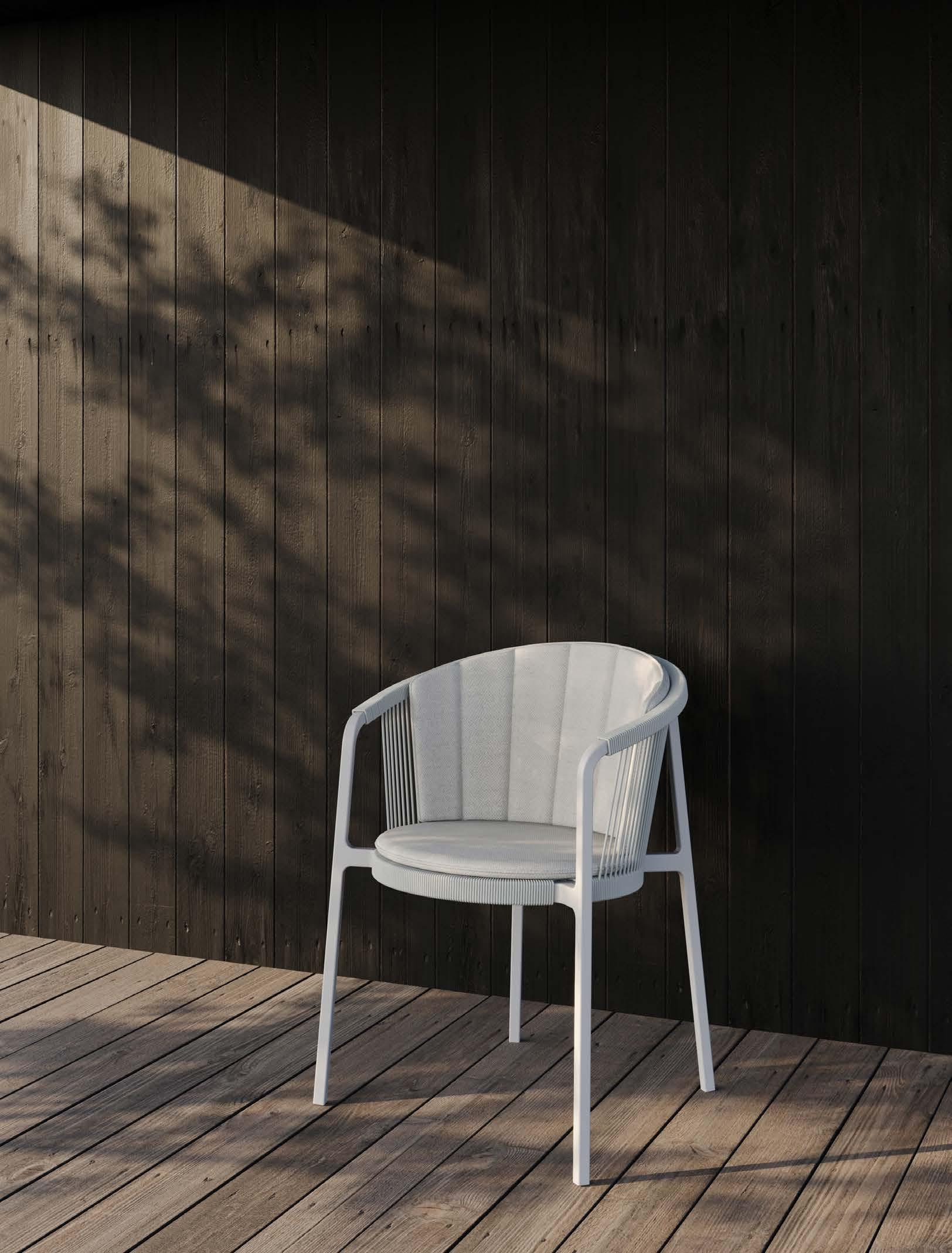 The Lagrasse seating pieces comprise a dining chair, a lounge chair and a two-seater, each featuring a simple powder-coated aluminium frame with a round backrest that extends to form the armrests. A woven cord wrapped around the backrest and armrests reflects the airy expression that underpins the design ethos of the collection.