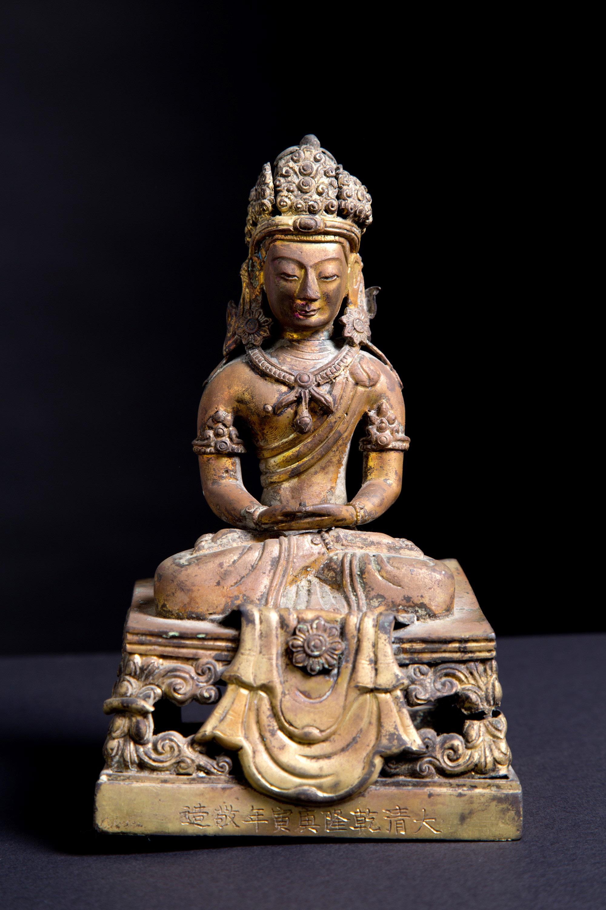 Scultura in bronzo dorato raffigurante “AMITAYUS”. Periodo Qianlong. Cina. 18,5x11x9 cm ca. B.A: 1.000 € Val.: 1.500/2.000 €