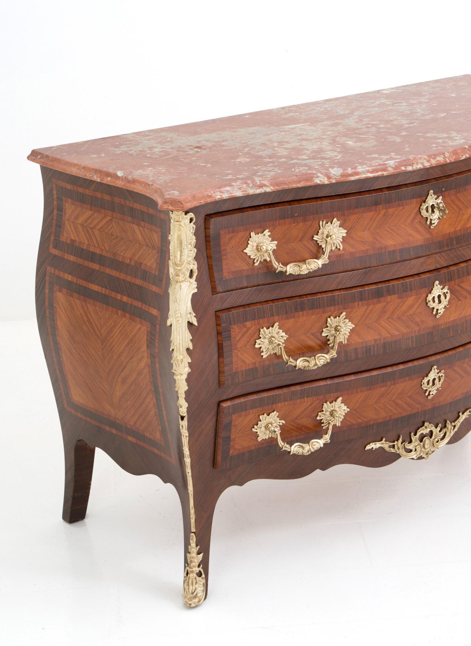 Comò lastronato in legni vari e finiture in bronzo con piano in marmo rosa. Inizi XX secolo. 83x118x52 cm ca. B.A: 400 € Val.: 700/900 €