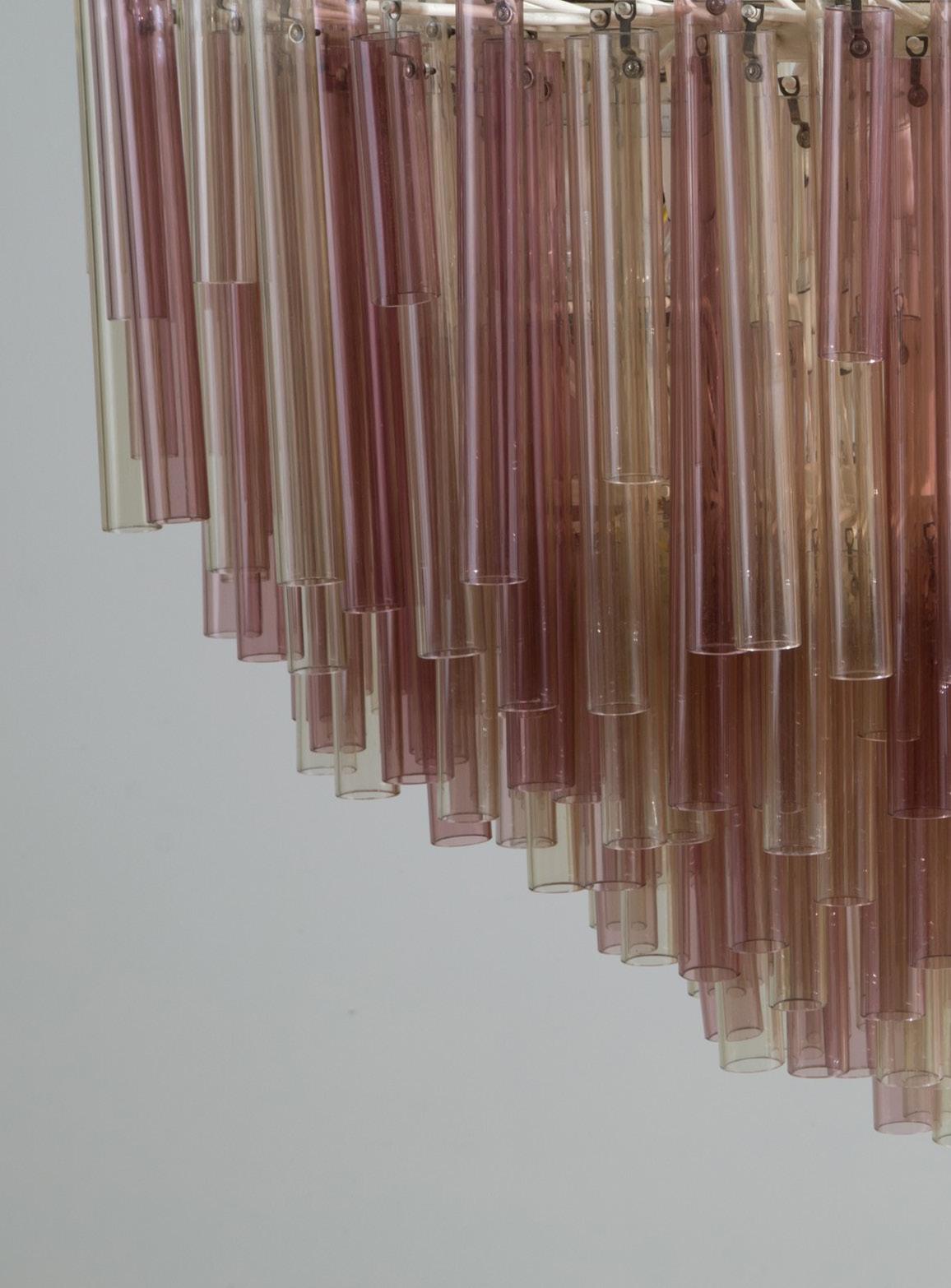 Lampadario venti luci con vetri tubolari lisci di di verse dimensioni e struttura in metallo verniciato bianco. Produzione VENINI, Murano. Anni ‘70. 70x80 cm ca. B.A: 2.000 € Val.: 3.000/4.000 €