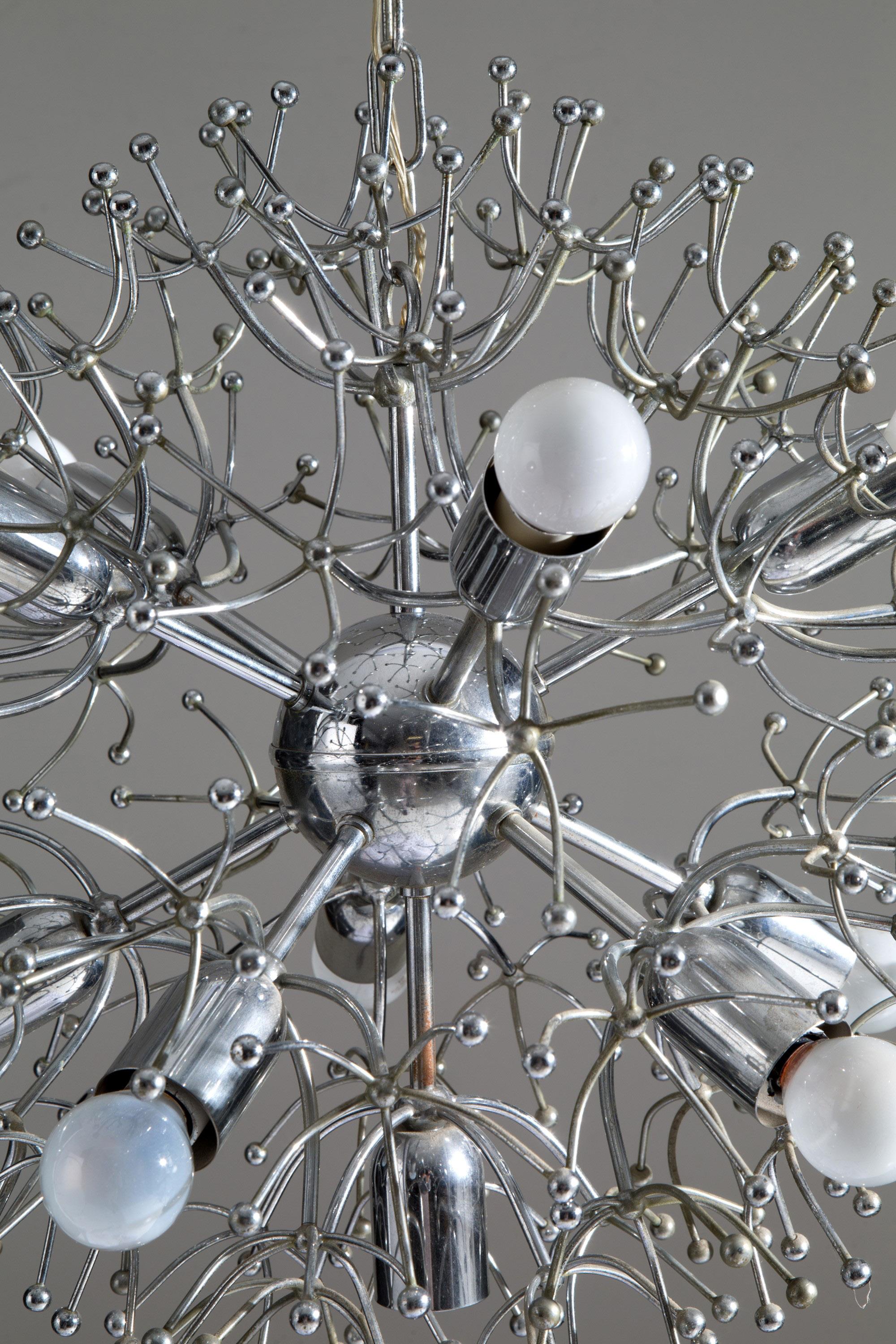 Lampadario sputnik in metallo cromato. Anni ‘60. 110x50 cm ca. B.A: 200 € Val.: 300/400 € GAETANO SCIOLARI