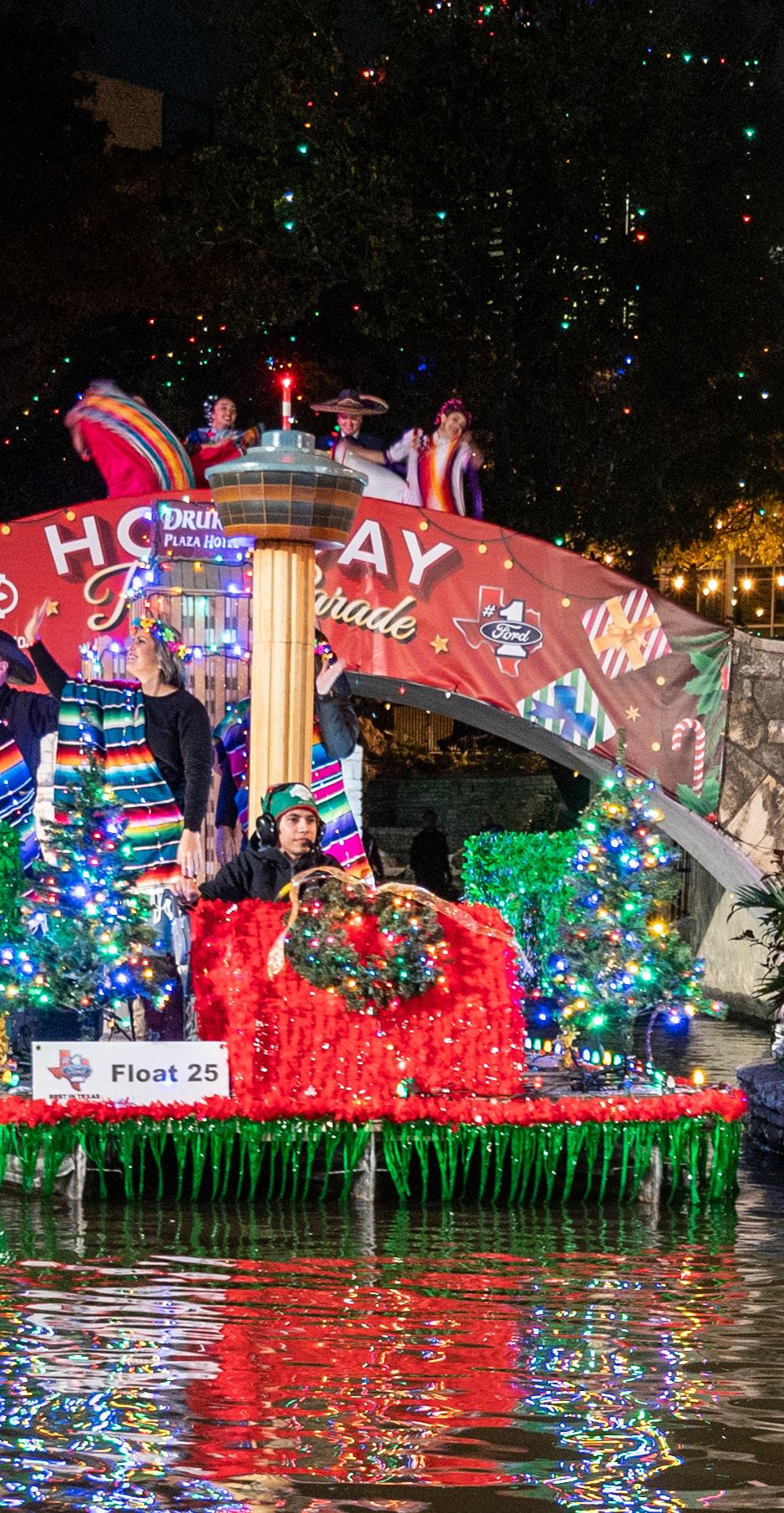 A night parade consisting of costumed float riders, Santa himself and illuminated by holiday lights on the San Antonio River Walk.
