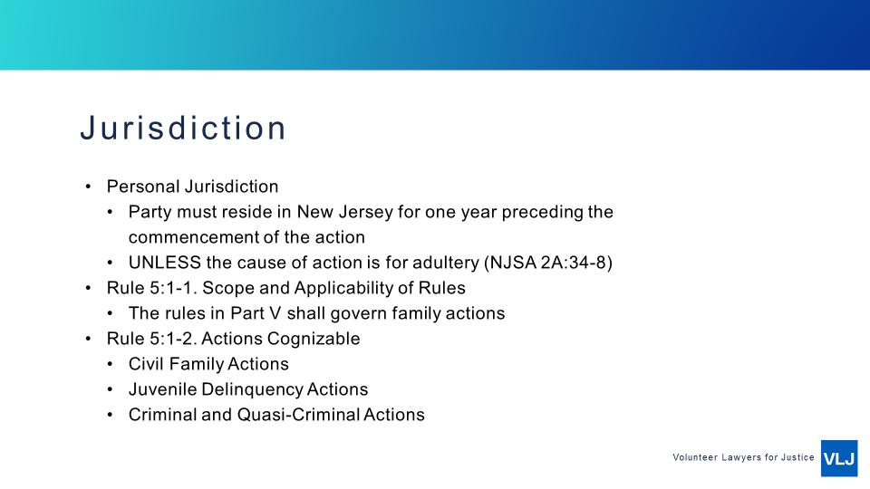 This CLE will provide an overview of New Jersey matrimonial law, and will focus on common procedures in divorce cases. The goal of this program is to familiarize non-family attorneys and with the divorce process in New Jersey. The training includes best practices and an overview of the commonly-seen issues and forms utilized during the clinic. By the conclusion of the program, participants should feel comfortable assisting with completing divorce pleadings, forms, and advising pro se litigants in VLJ-run Divorce Clinics.