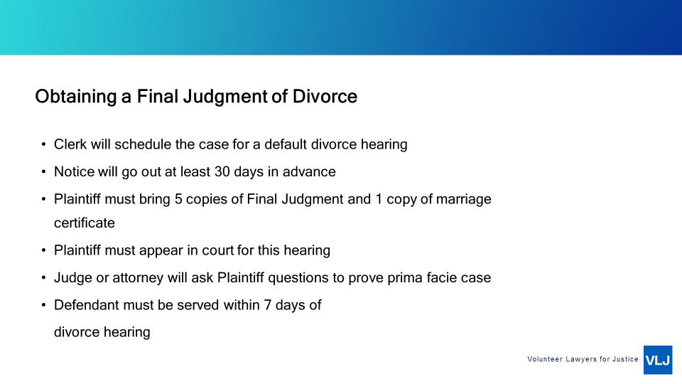 o If settlement is reached a court date is scheduled for final judgment of divorce to be issued