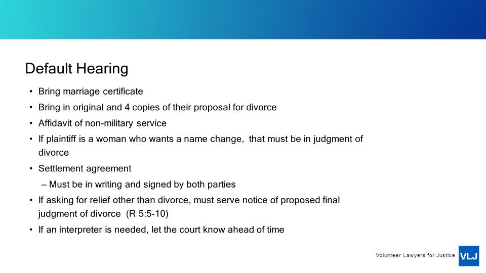 • At default hearing Plaintiff answers questions to prove prima facie case and divorce is granted