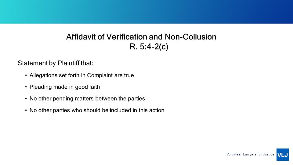 • Documents to file with response are, Affidavit of Verification and Non-Collusion, Affidavit or Certification of Insurance Coverage, Confidential Litigant Information Sheet, Affidavit or Certification of Notification of Complementary Dispute Resolution Alternatives, filing fee ($175 + $25 if the parties have minor children) OR Fee Waiver.