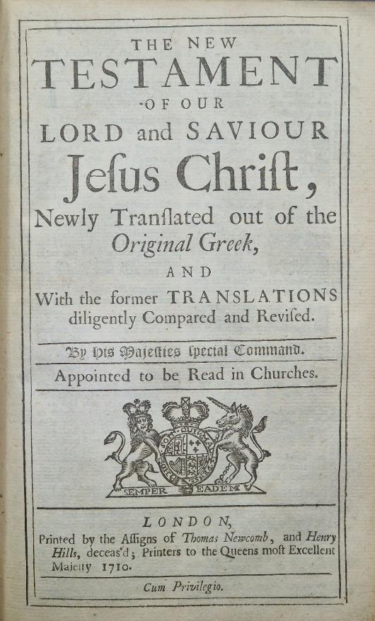 Bound with The Book of Common Prayer, London: Charles Bill and the Executrix of Thomas Newcomb, deceased, 1709. And with The Whole Book of Psalms: Collected into English Metre by Thomas Sternhold, John Hopkins, And Others. London: Printed by J. Heptinstall, 1717. 8vo. 192x120mm. Unpaginated. Collates as follows: BCP a4, A8G6. Bible pi1, A8-Z8, As8-Zz8, Aaa8-Zzz8, Aaaa8-Cccc4. Psalms: A4-L4. General title for the Bible dated 1715 with the separate title page for the New Testament dated 1710.