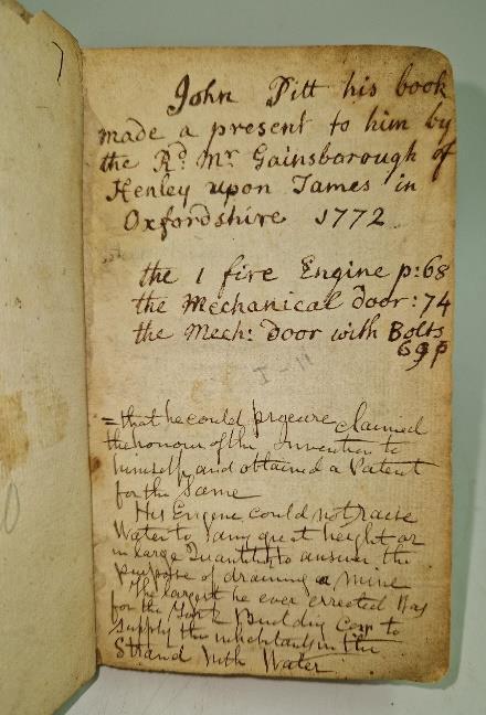 On the upper cover is written, in a contemporary hand “Marquis of Worcester’s, his Invention”. The title page has the ownership inscription “Richd Samuel” and a blank preliminary leaf has the inscription “John Pitt his book made a present to him by the Rd. Mr Gainsborough of Henley upon Tames in Oxfordshire 1772”. Gainsborough is, unquestionably, Humphrey Gainsborough (1718-1776), a non-conformist minister at the Independent Church in Henley. He was also an engineer and inventor who designed bridges and locks in and around Henley and influenced James Watt in his work on the steam engine. He was also the brother of the painter Thomas Gainsborough. One of Gainsborough’s engineering projects was a bridge taking the Henley to Wargrave road over “Happy Valley”. The designer of the bridge was the brother of William Pitt. John Pitt was the son of William. Born in 1756, he would have been sixteen when Gainsborough gave him this book. It is just the sort of book that would be given to an intelligent sixteen year old. Edward Somerset’s most famous invention was his “Water-commanding Engine” which was a prototype for what would become the steam engine. This would certainly have appealed to Gainsborough and provides a nice link between the two men.