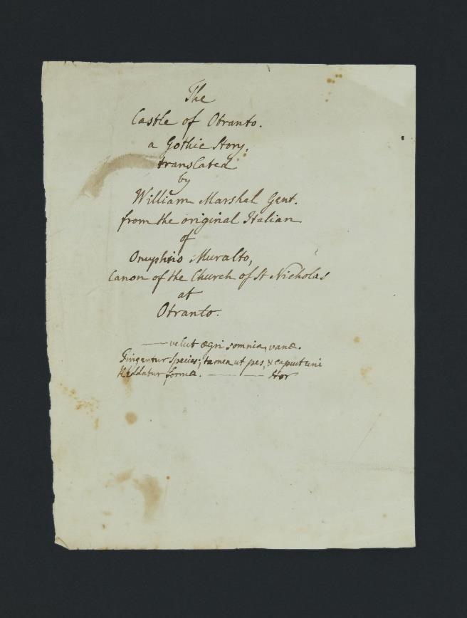 “The Castle of Otranto. a Gothic Story. translated by William Marshal Gent. from the original Italian of Onuphrio Muralto, Canon of St Nicholas at Otranto. velut egri somnia vane./ Fingentur species; tamen ut pes, &caput uni/ Reddatur forme Hor.”