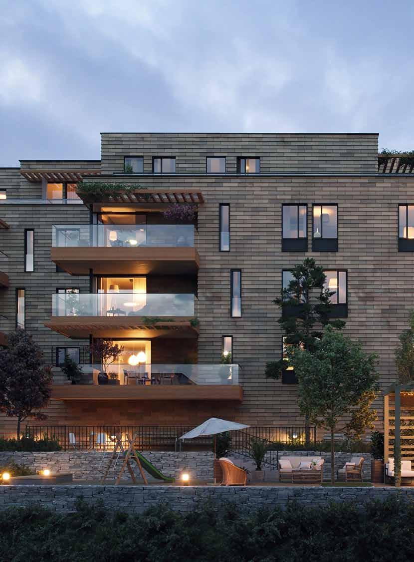 Bygningene er harmonisk utformet og godt tilpasset uteoppholdsplassene. Samtidig har det vært spesielt viktig å ivareta god skjerming og privatliv for terrasser og inne i selve leilighetene. Forholdet mellom landskap, arkitektur, interiør, fellesarealer og leiligheter fremstår her i en vakker og elegant helhet.