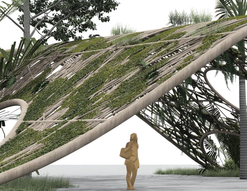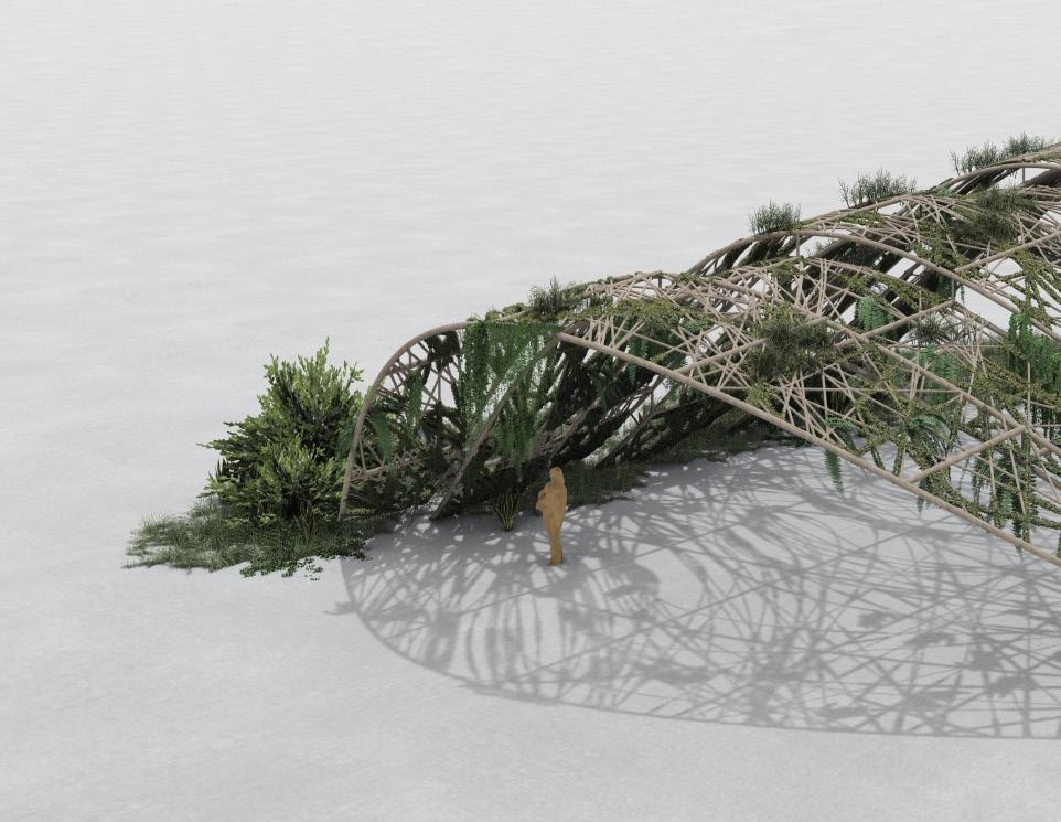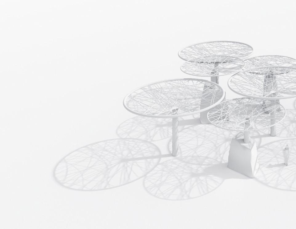 A welcoming outdoor lobby for shift. A silhouette emerges from the ground with a pattern, as organic as the branches, creating constantly changing shadows. Lateral incisions leave space for nature to emerge and take over.