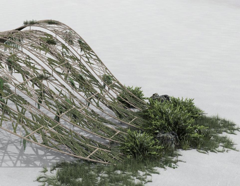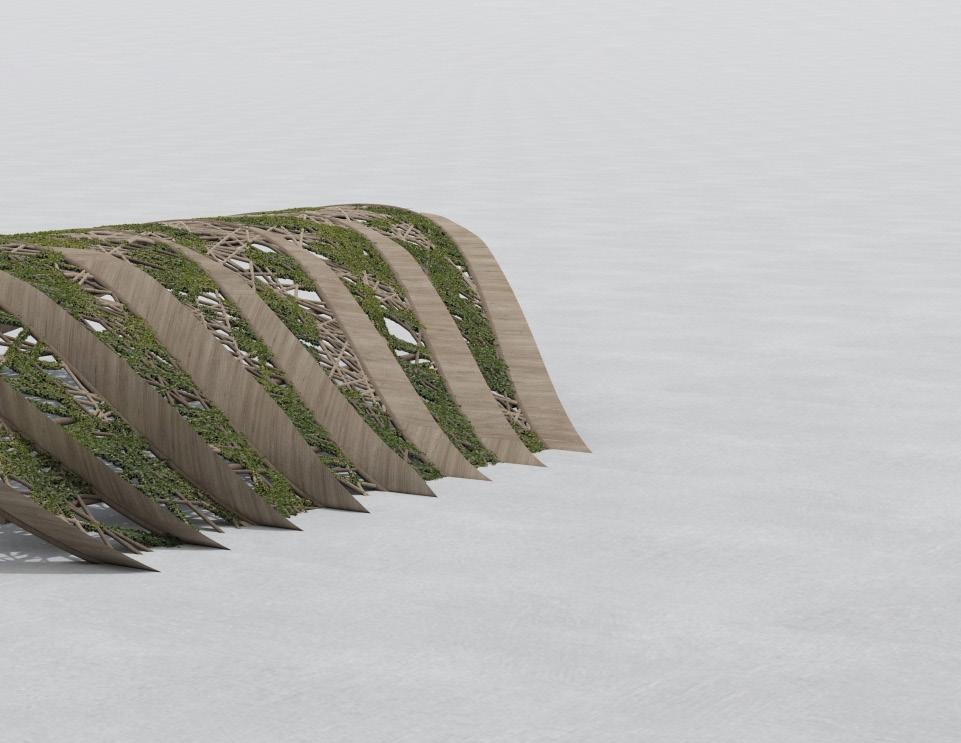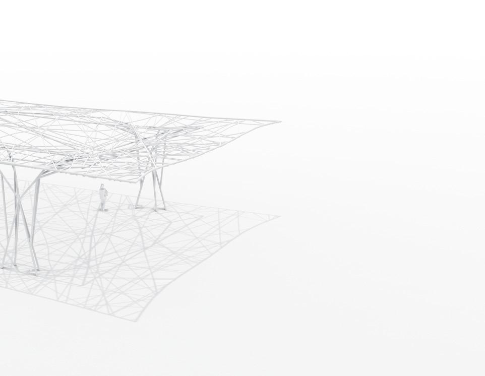 A welcoming outdoor lobby for shift. A silhouette emerges from the ground with a pattern, as organic as the branches, creating constantly changing shadows. The branching surface is split on diferent heights creating a smooth and organic experience .