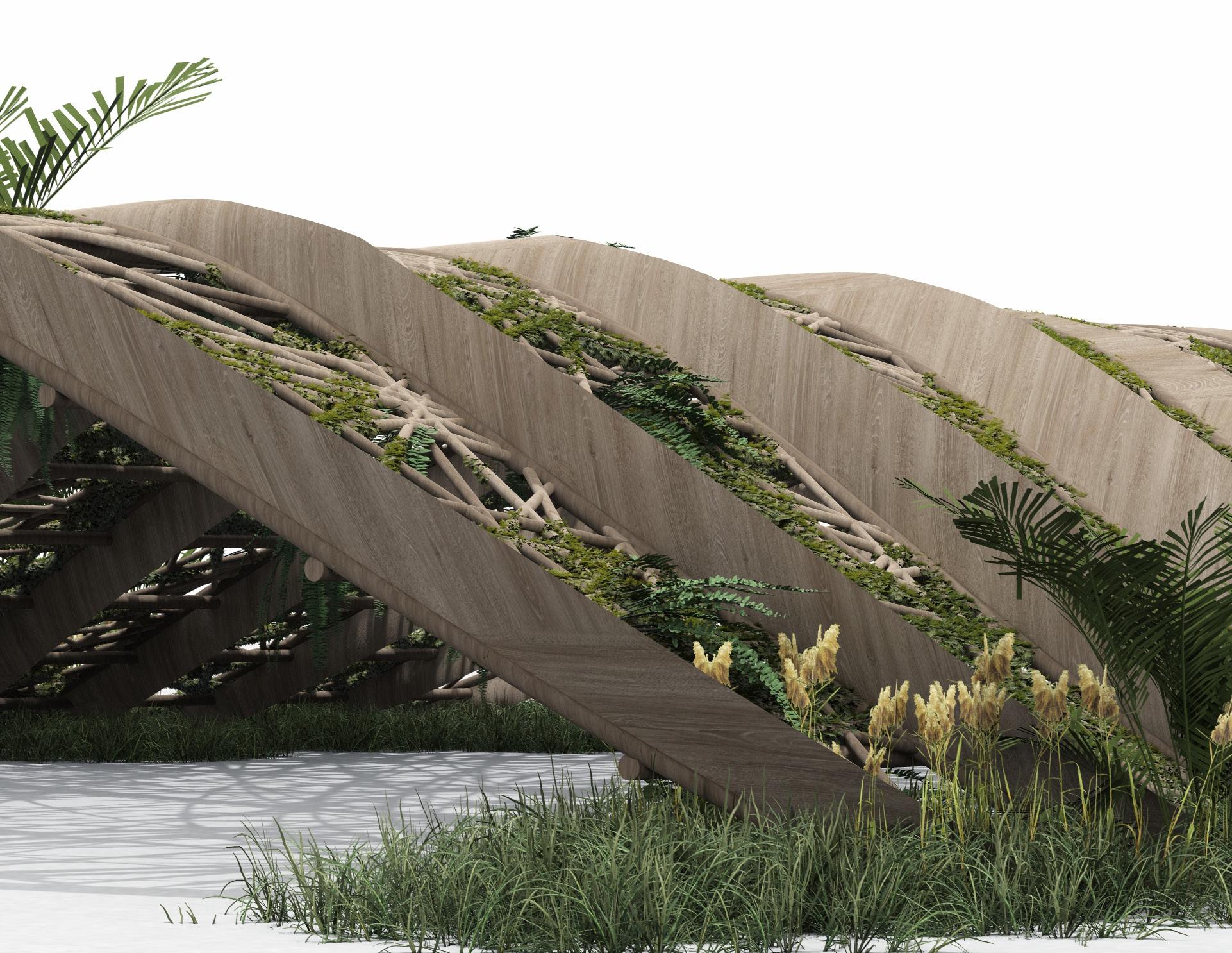 Inspired by a set of tree logs and linked by their branches, this access conects its structure allowing ivy and plants to take over and emerge on its own.