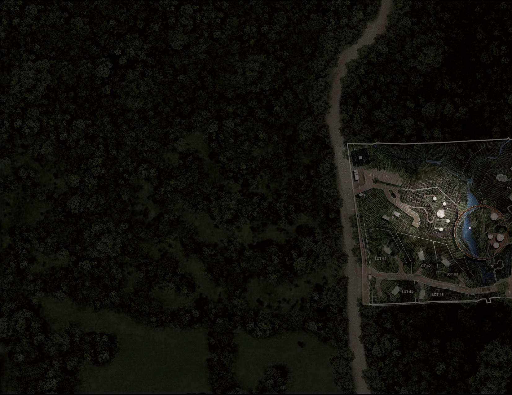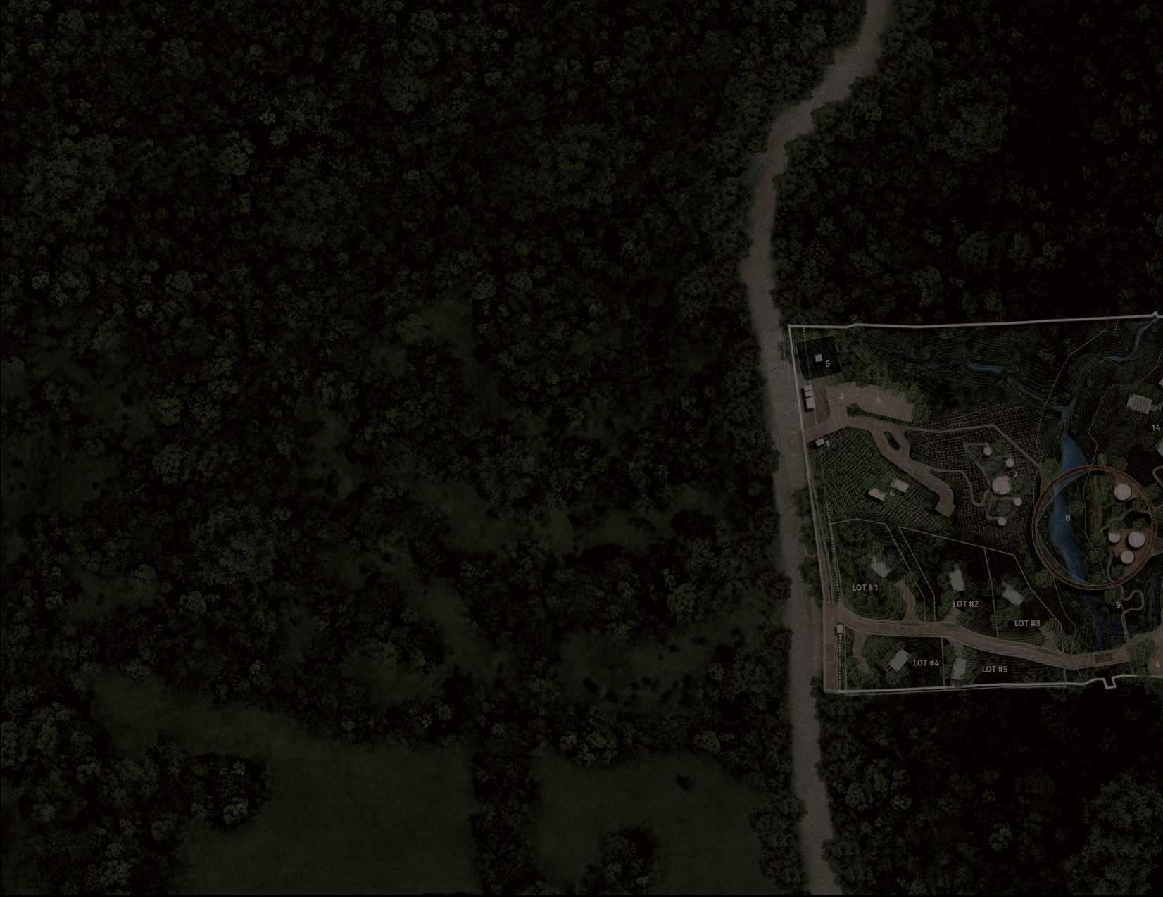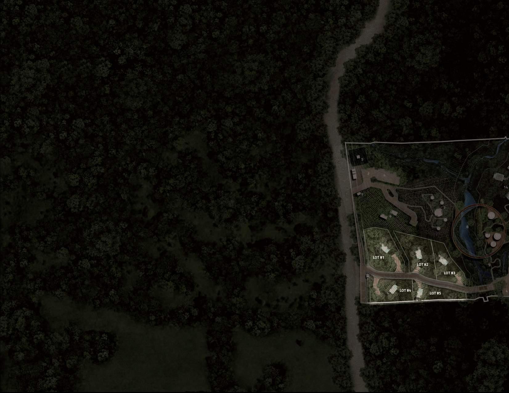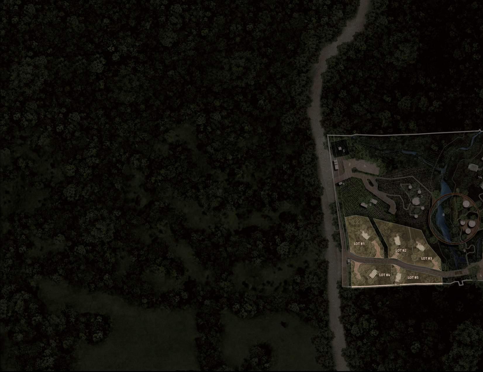 PERMACULTURE FOODFOREST 116.38 m2 EA 62.95 m2 196.39 m2 135 m2 330 m2 16 m2 100 m2 180 m2 1093.7 m2 550 m2 174 m2 78 m2 120 m2 420 m2 123.79 m2 EA 103.2 m2 EA 102 m2 12 m2 218.86 m2 2995.69 m2 5495.07 m2 113261.56m2 1.32 Hectars 01 02 03 04 04 05 06 07 08 09 10 11 12 13 14 15 16 17 18 Main Entrance Check Point (2) Waste & recycle Wharehouse Parking Lot 01 Parking Lot 02 Water treatment plant Community spaces Restaurant & pods Botanical Garden Sculptural garden Community spaces Share kitchen & lobby Common area #1 Common area #3 Cabins (6) View tower (2) Wellness Temezcal Common area #2 Permaculture Food Forest Total Area