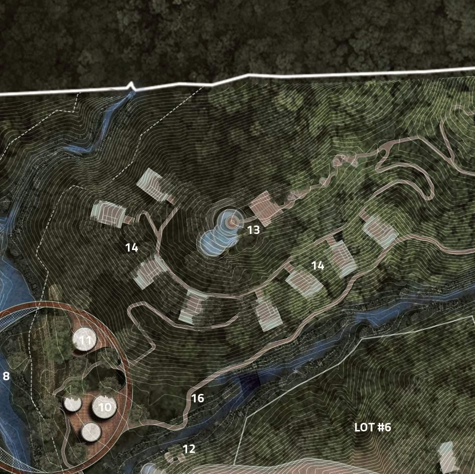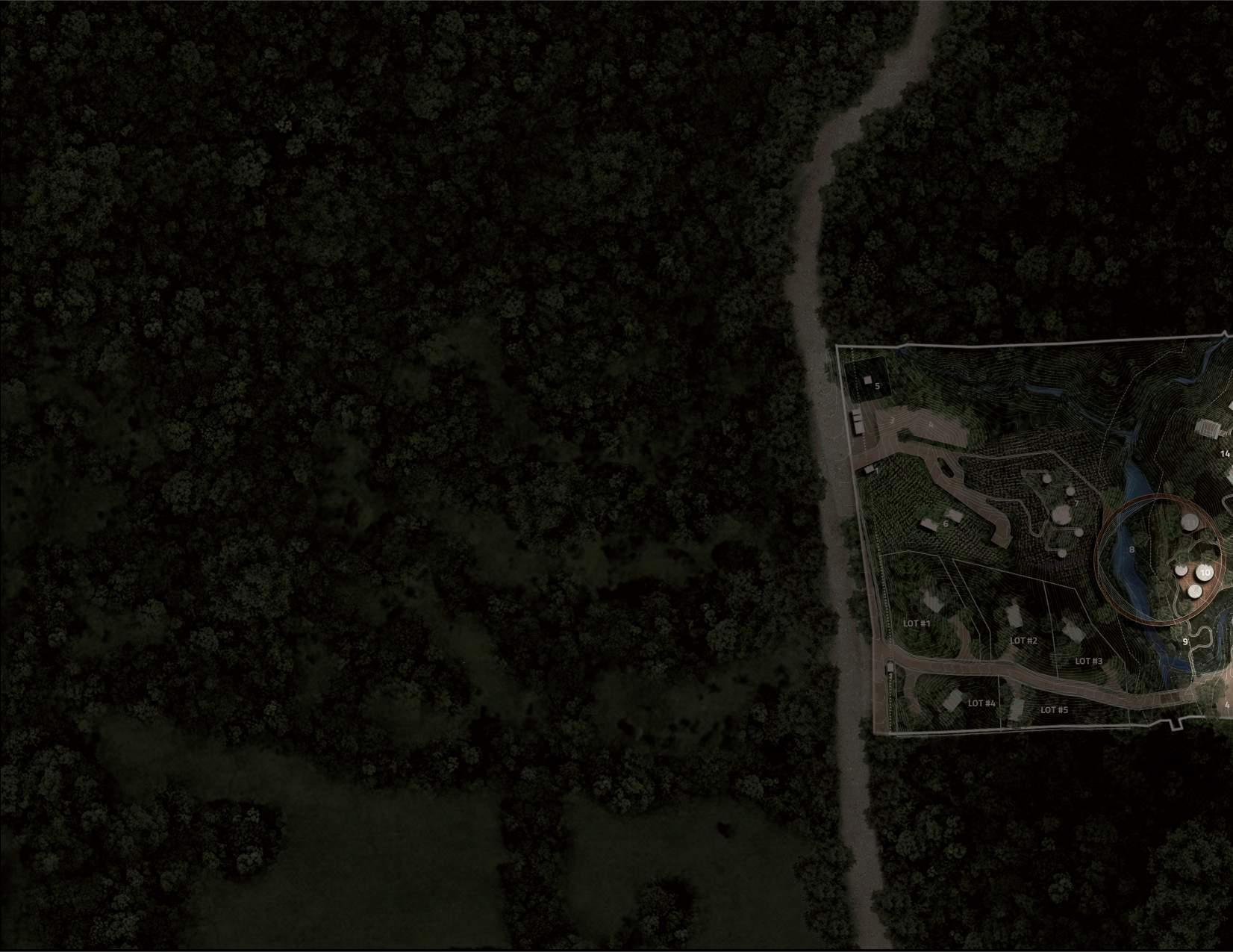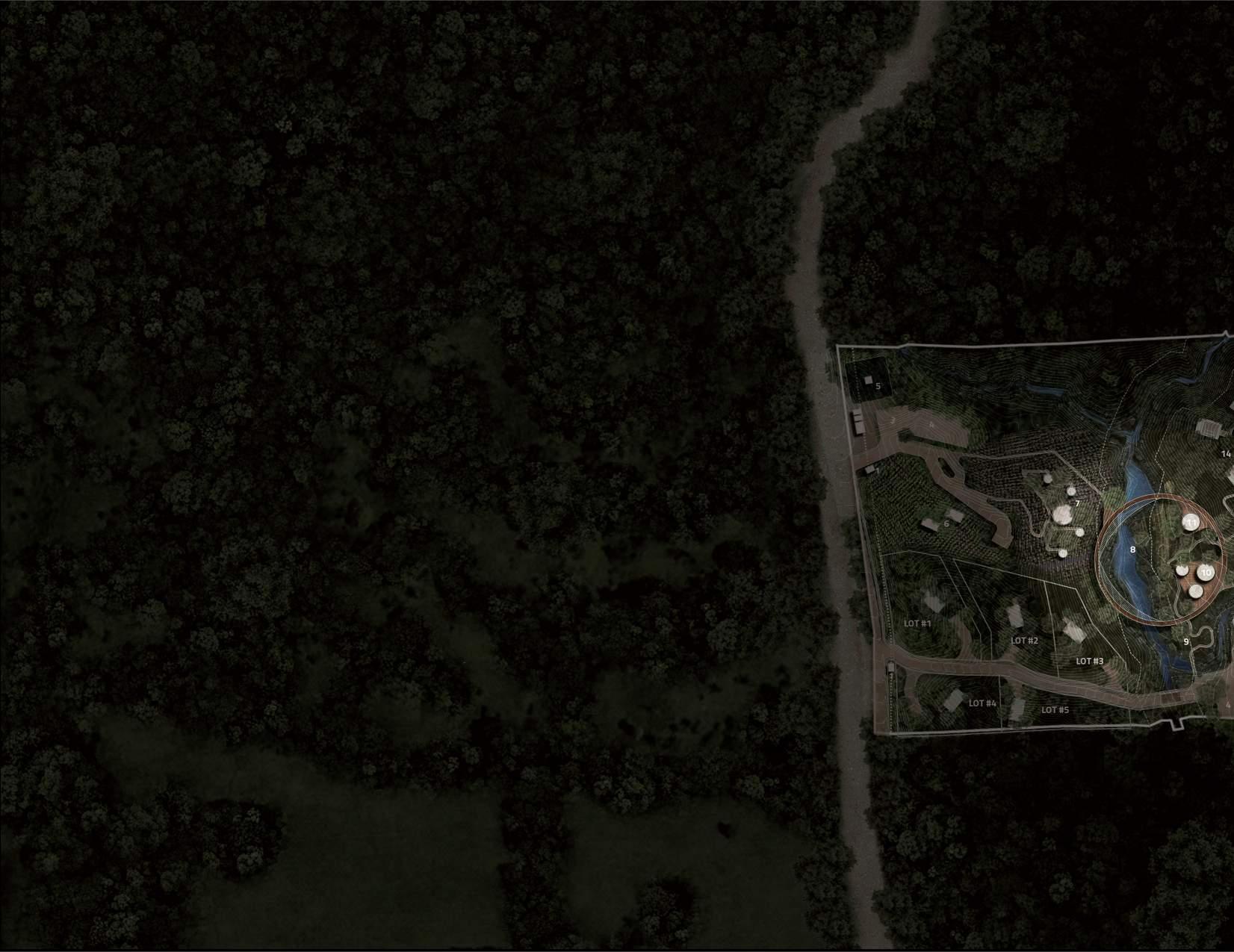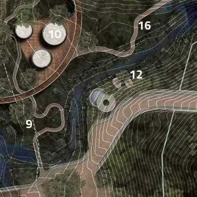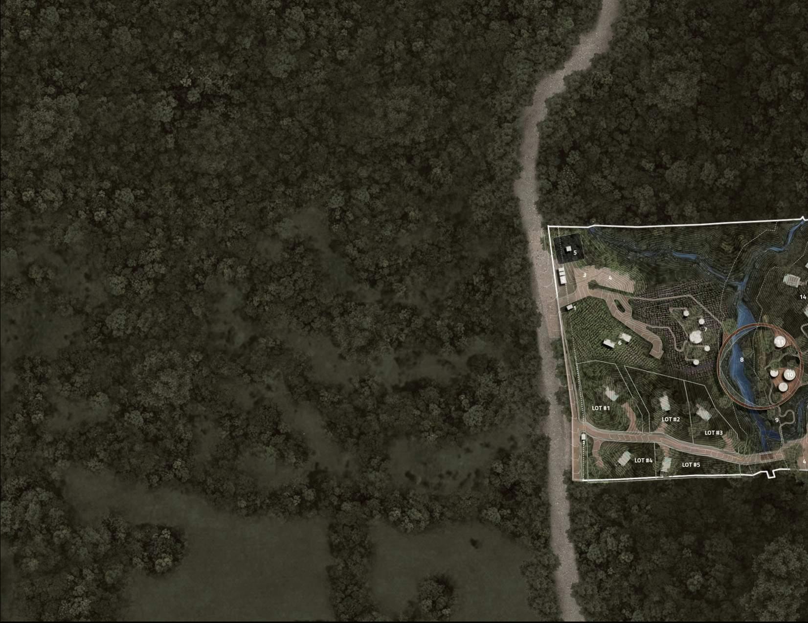 PERMACULTURE FOODFOREST 116.38 m2 EA 62.95 m2 196.39 m2 135 m2 330 m2 16 m2 100 m2 180 m2 1093.7 m2 550 m2 174 m2 78 m2 120 m2 420 m2 123.79 m2 EA 103.2 m2 EA 102 m2 12 m2 218.86 m2 2995.69 m2 5495.07 m2 113261.56m2 1.32 Hectars 01 02 03 04 04 05 06 07 08 09 10 11 12 13 14 15 16 17 18 Main Entrance Check Point (2) Waste & recycle Wharehouse Parking Lot 01 Parking Lot 02 Water treatment plant Community spaces Restaurant & pods Botanical Garden Sculptural garden Community spaces Share kitchen & lobby Common area #1 Common area #3 Cabins (6) View tower (2) Wellness Temezcal Common area #2 Permaculture Food Forest Total Area