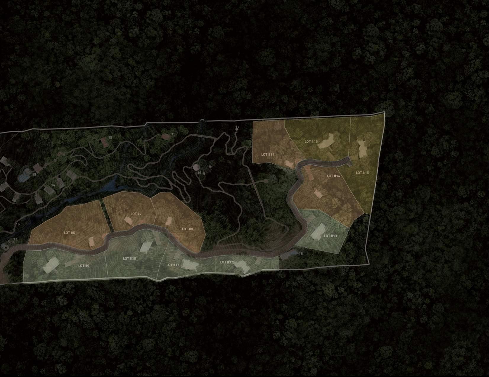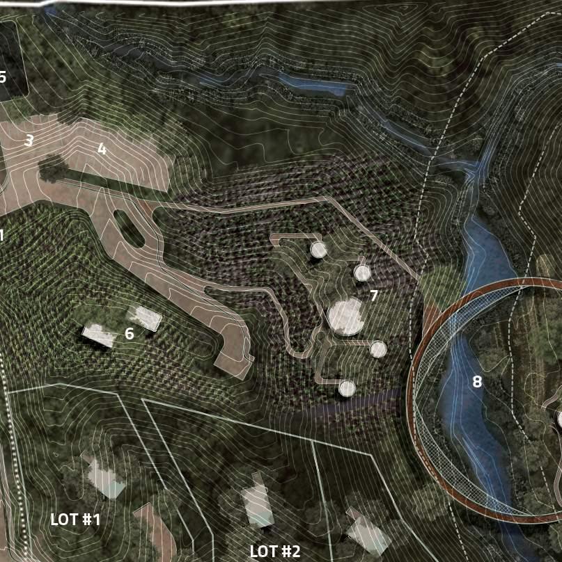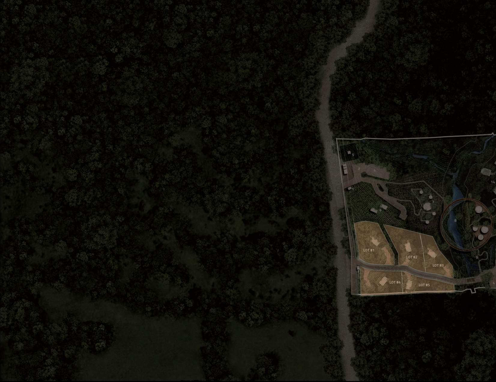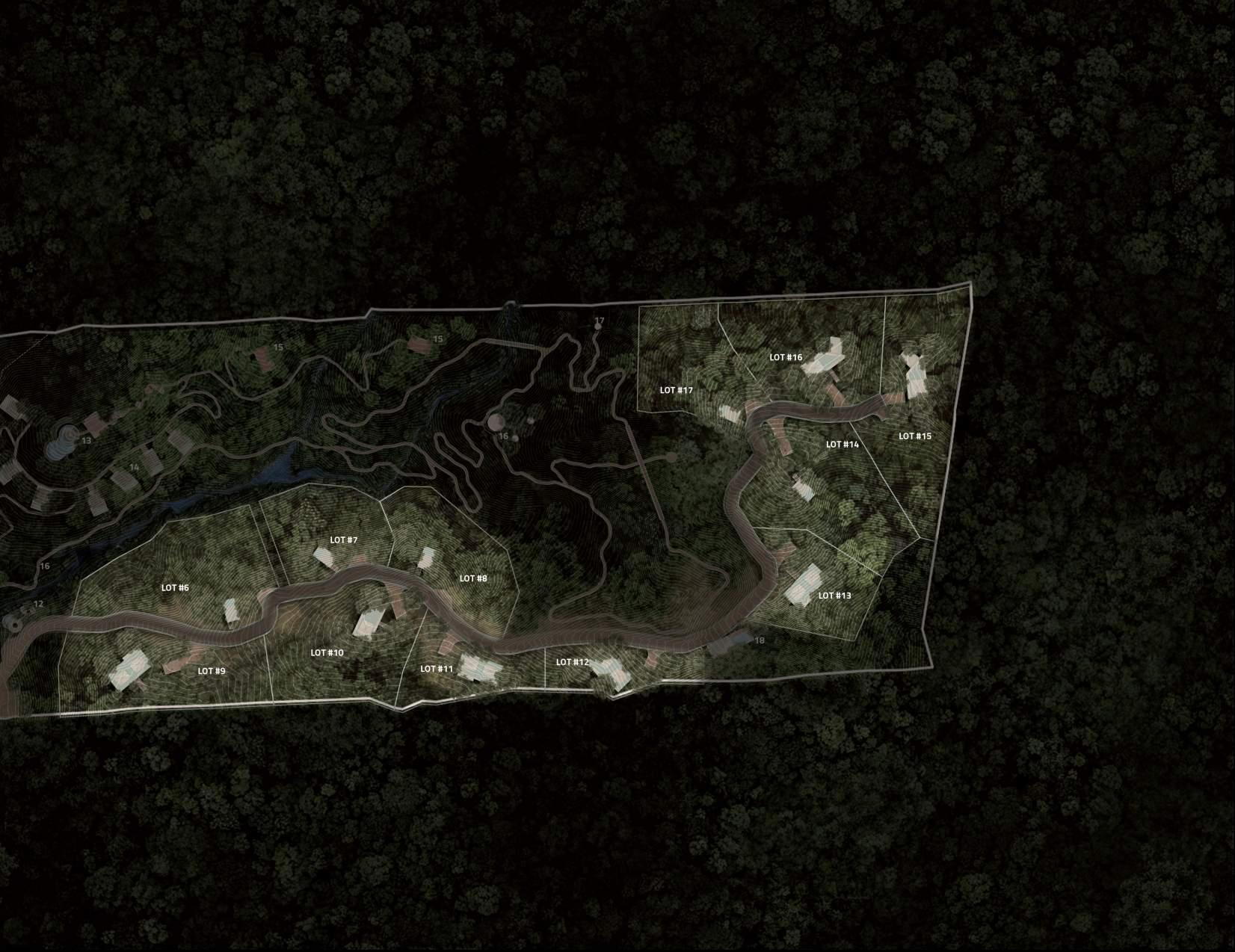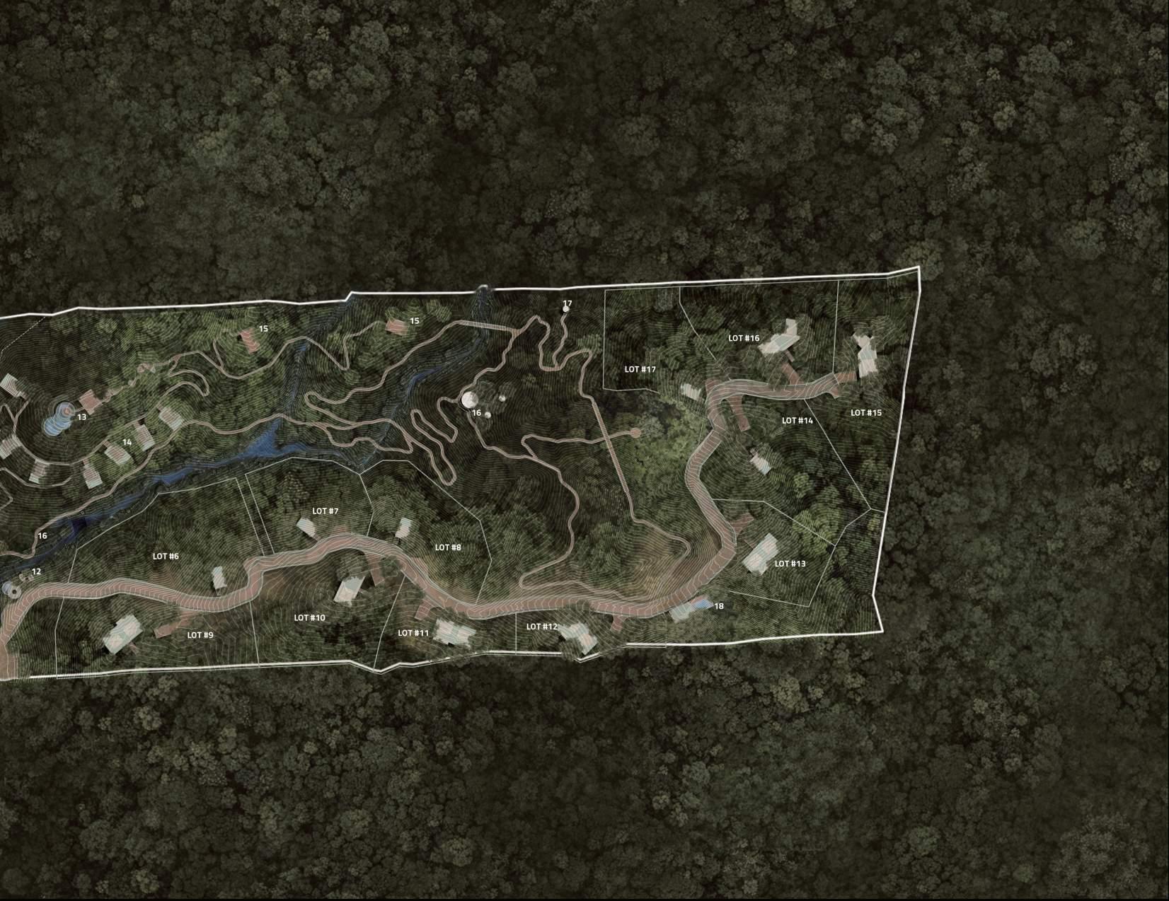 PERMACULTURE FOODFOREST 116.38 m2 EA 62.95 m2 196.39 m2 135 m2 330 m2 16 m2 100 m2 180 m2 1093.7 m2 550 m2 174 m2 78 m2 120 m2 420 m2 123.79 m2 EA 103.2 m2 EA 102 m2 12 m2 218.86 m2 2995.69 m2 5495.07 m2 113261.56m2 1.32 Hectars 01 02 03 04 04 05 06 07 08 09 10 11 12 13 14 15 16 17 18 Main Entrance Check Point (2) Waste & recycle Wharehouse Parking Lot 01 Parking Lot 02 Water treatment plant Community spaces Restaurant & pods Botanical Garden Sculptural garden Community spaces Share kitchen & lobby Common area #1 Common area #3 Cabins (6) View tower (2) Wellness Temezcal Common area #2 Permaculture Food Forest Total Area