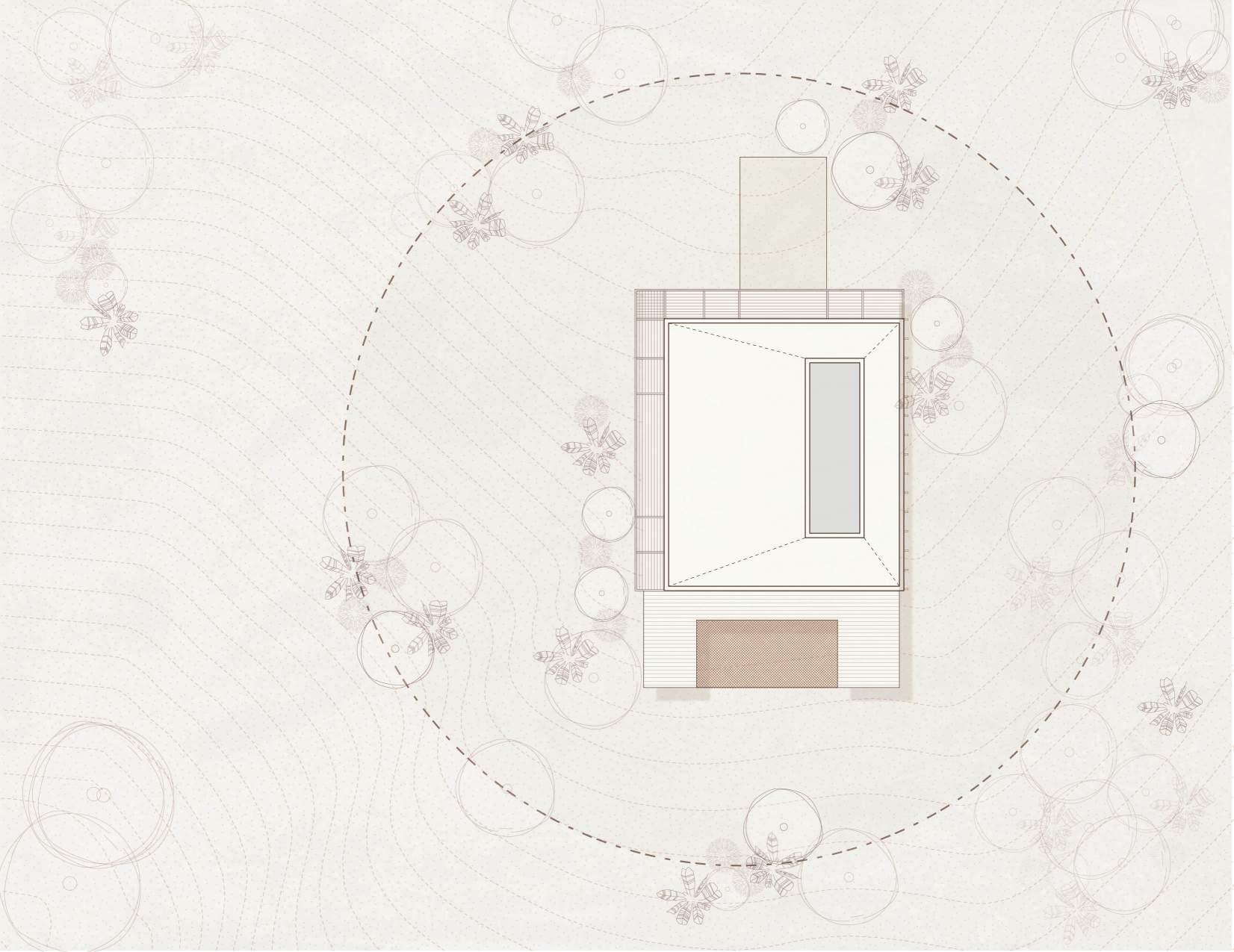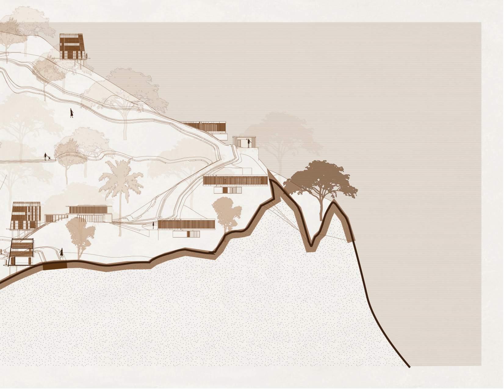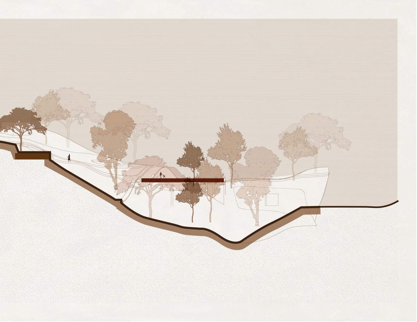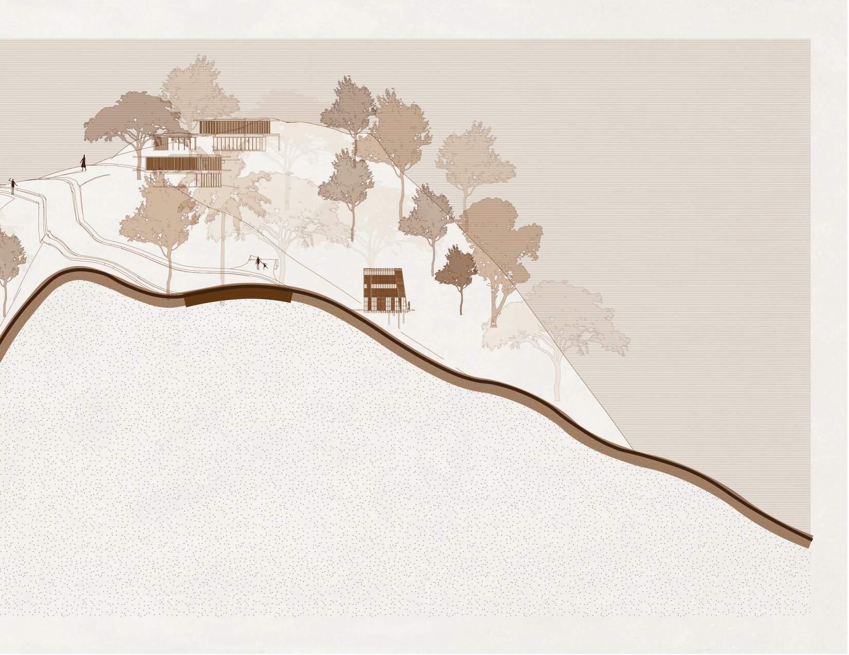 The project explores the concept of grounding ourselves through nature by emphasizing the interconnectedness and shared experiences among different ecosystems. It seeks to reconnect individuals, such as visitors, residents, and temporary occupants, with their own essence through the various approaches of nature while maintaining a sense of simplicity. These approaches manifest as diverse landscapes that share a common core and evolve as one journeys through the site.