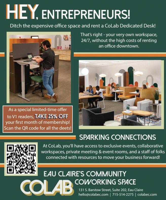 Eau Claire Area Chamber of Commerce 101 N Farwell St, Eau Claire • (715) 834-1204 • eauclairechamber.org Part of Eau Claire for 100+ years, the EC Chamber advocates for the progres sive development of Eau Claire through business. The Chamber advocates for business needs with public policy; diversity, equity, and inclusion in the workplace; offers professional development and youth apprenticeship resources; youth leader ship programs, and more.