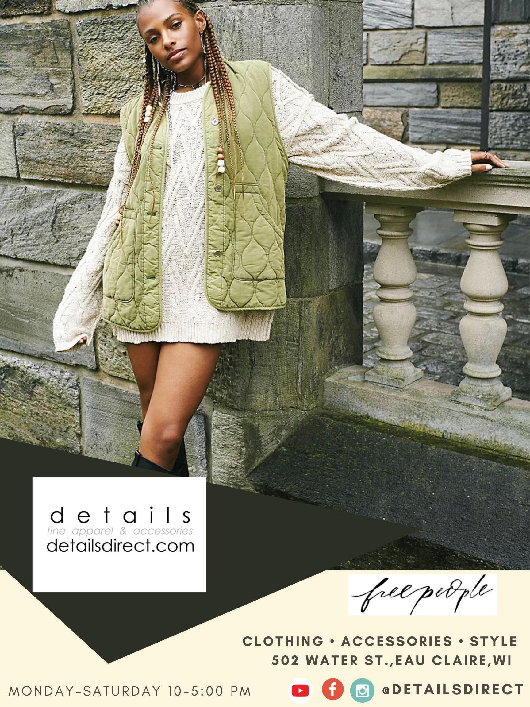 Details 502 Water Street, Eau Claire ^ details direct.com Details carries an eclectic mix of classic, art-to wear, casual, career, and occasion wear. Details’ designers are a mix of best-selling brands and small, innovative designers making limited quality items.