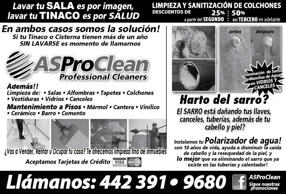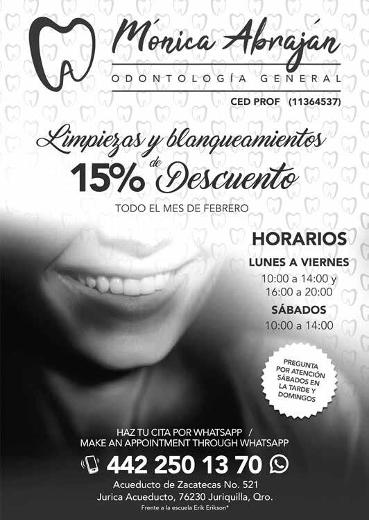 442.871.6666 vozdejuriquilla@gmail.com Febrero Edición 207 ¡Feliz mes de la Amistad! SERVICIO DIRECTO 442 222 8563 / 442 140 7801 REFACCIONES ORIGINALES GARANTÍA POR ESCRITO GRACIAS a nuestros AMABLES CLIENTES por su preferencia desde 1980 en Ciudad de México y sucursal en QUERÉTARO desde 2004 ATENCIÓN Y HONESTIDAD Reparación de refrigeradores lavadoras, Secadoras y centros de lavado en todas las marcas UNA NUEVA EXPERIENCIA DE ESTUDIO DIGITAL Las tradicionales hojas de trabajo de Kumon ahora se pueden estudiar de manera una tableta. C INFORMES PÁGINA 2 a la 7 COLEGIO SUNHILLS VALLEY Querétaro: O : 442 254 34 50 Tel. 442 194 63 22 Productos de alta calidad autorizados ante la Secretaría de Salud FUMIGACIÓN, DESINFECCIÓN, SANITIZACIÓN Y CONTROL DE PLAGAS Tecnológia Ca dady Servicio 30 AÑOS DE Empecemos el año con CERO Cucarachas $500 Oferta para Casa y Negocio en Juriquilla. FUMIGACIÓN SPE ECIALIZADA EN CUCARACHA 442-171-72-73 Aplican restricciones ¡¡¡ Ya estamos en Juriquilla!!! REPARACIÓN DE: • Lavadoras • Secadoras • Refrigeradores • Hornos de microondas • Hornos empotrados • Estufas 442.251.5830 442.394.6135 10% de descuento