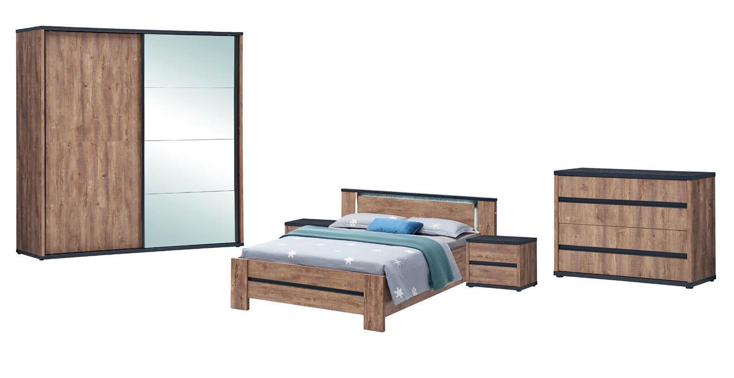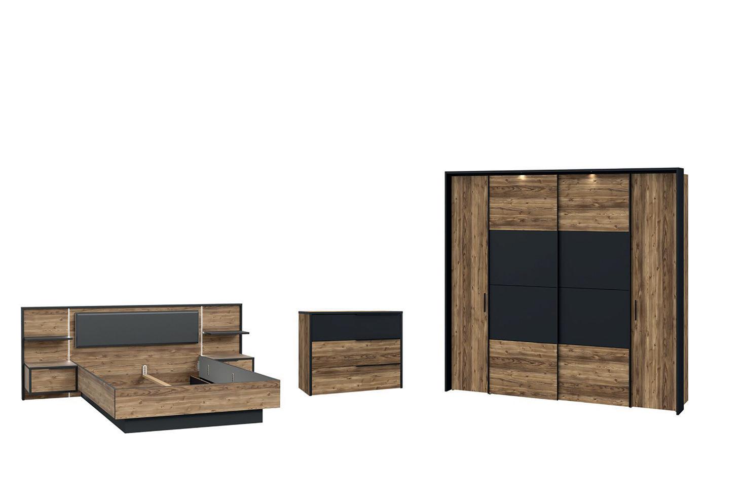Lit 160 x 200 cm, 2 chevets, commode et garde-robe largeur 279 cm