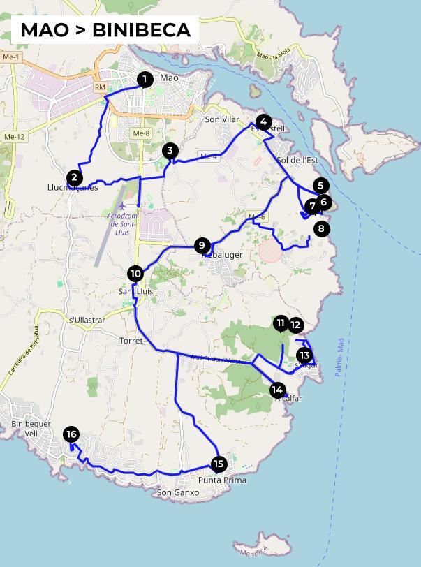 Vandaag brengt onze route je buiten de grenzen van het centrum van Maó naar een groot aantal interessante en aantrekkelijke plaatsen en eindigt de dag in de ontspannende kustplaats Binibeca.