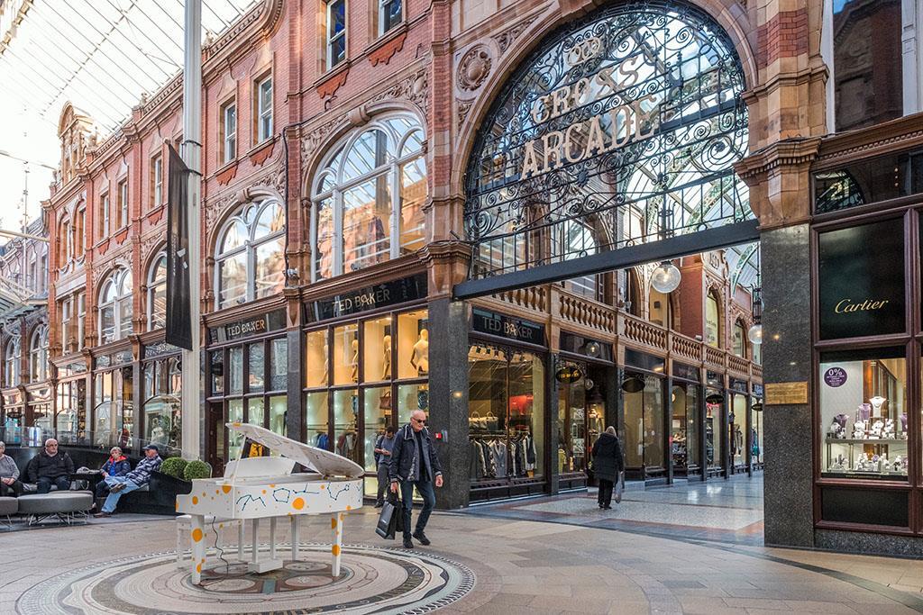• Grand Arcade werd opgericht in 1897. Het is een van de mooiste winkelgalerijen in Leeds en richt zich nu, in vergelijking met andere galerijen, meer op horeca en minder op winkelen. Naast de altijd populaire Merrion Street dragen de slingers, die over deze galerij zijn gespannen, en de unieke kasteelvormige Potts Clock bij aan de charme van deze galerij.