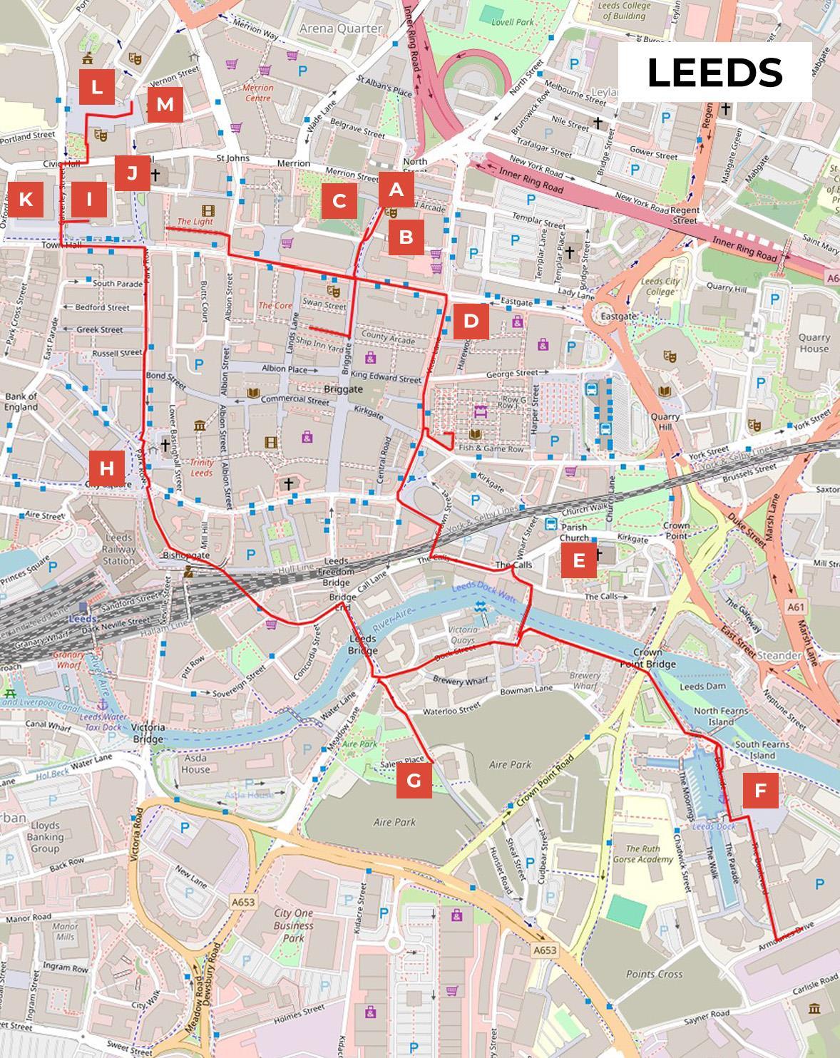 • Beginpunt: Historische winkelgalerijen Leeds (zie locatie op de kaart)