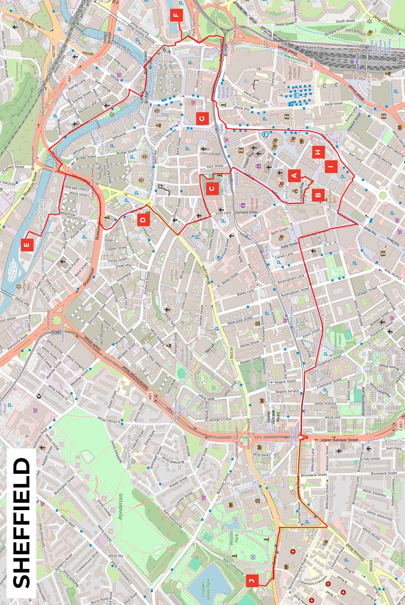 • Beginpunt: Sheffield Town Hall (zie locatie op de kaart)