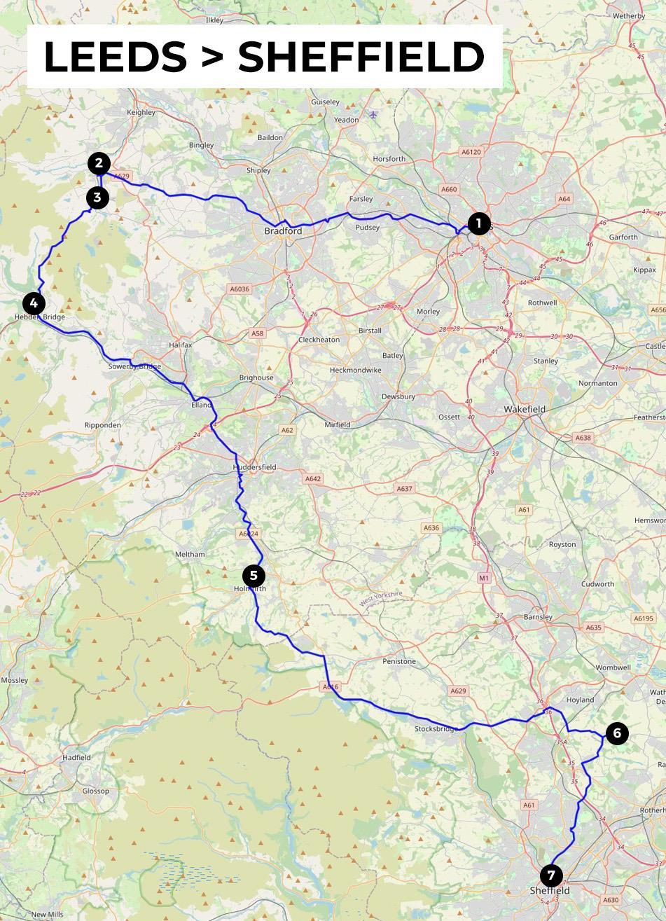 Reis in zuidoostelijke richting vanaf Hebden Bridge, omzeil Halifax in het zuiden en rijd om Huddersfield heen om Holmfirth te bereiken.