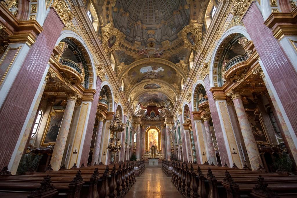 erop uitgebeeld. Hij is de heilige aan wie de kerk gewijd is. Ook het barokke interieur is écht wel indrukwekkend. Met een glazen lift kun je tot boven in de ovale koepel en kun je daar in detail de prachtige fresco’s bewonderen van Rottmayr.