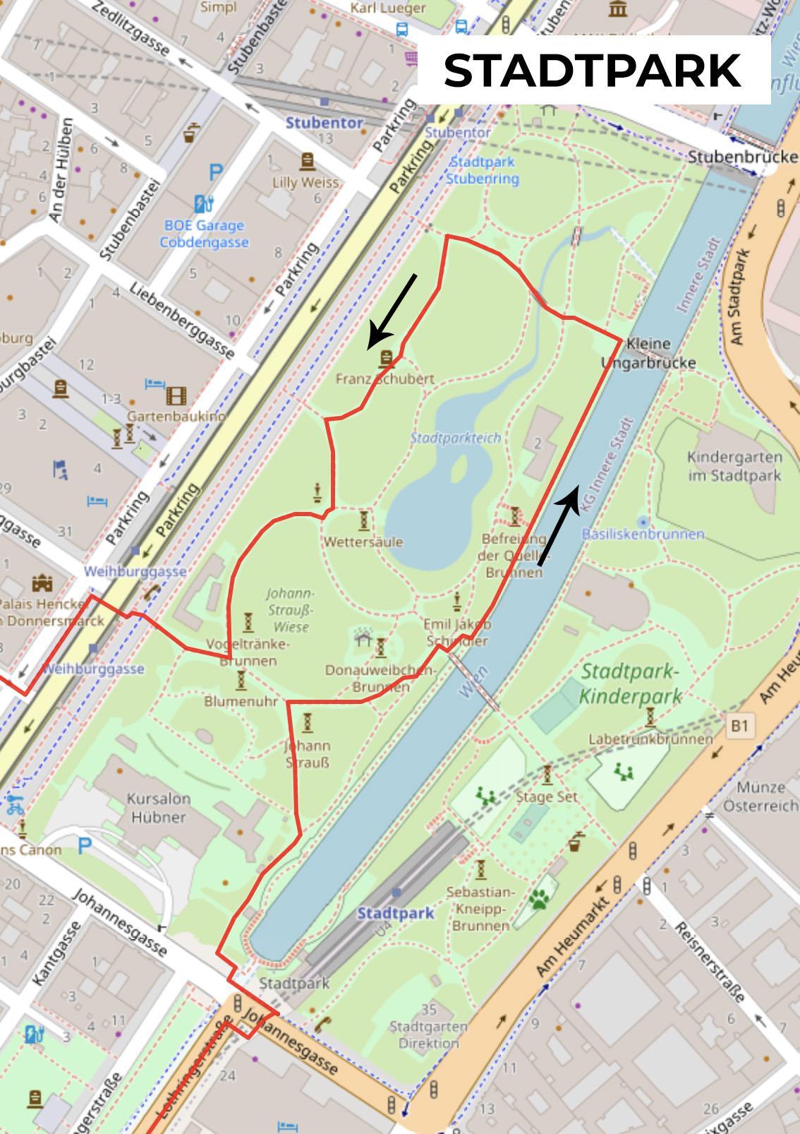 Ons startpunt is de metrohalte van het Stadtpark, uitgang Johannesgasse. Dit metrostation is van de hand van Otto Wagner, een kunstenaar-architect die lid was van de Wiener Secession, een Jugendstilbeweging. Verlaat het metrostation naar rechts en neem de 2de ingang van het park.