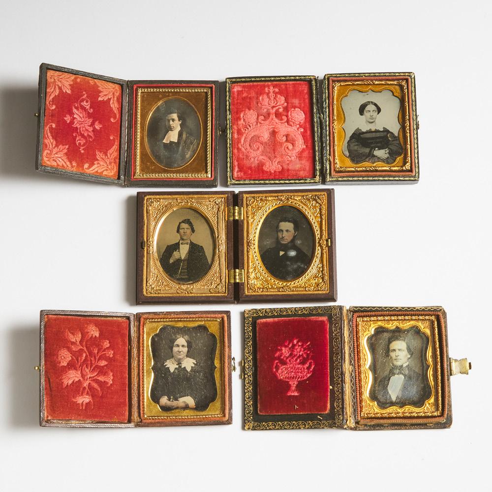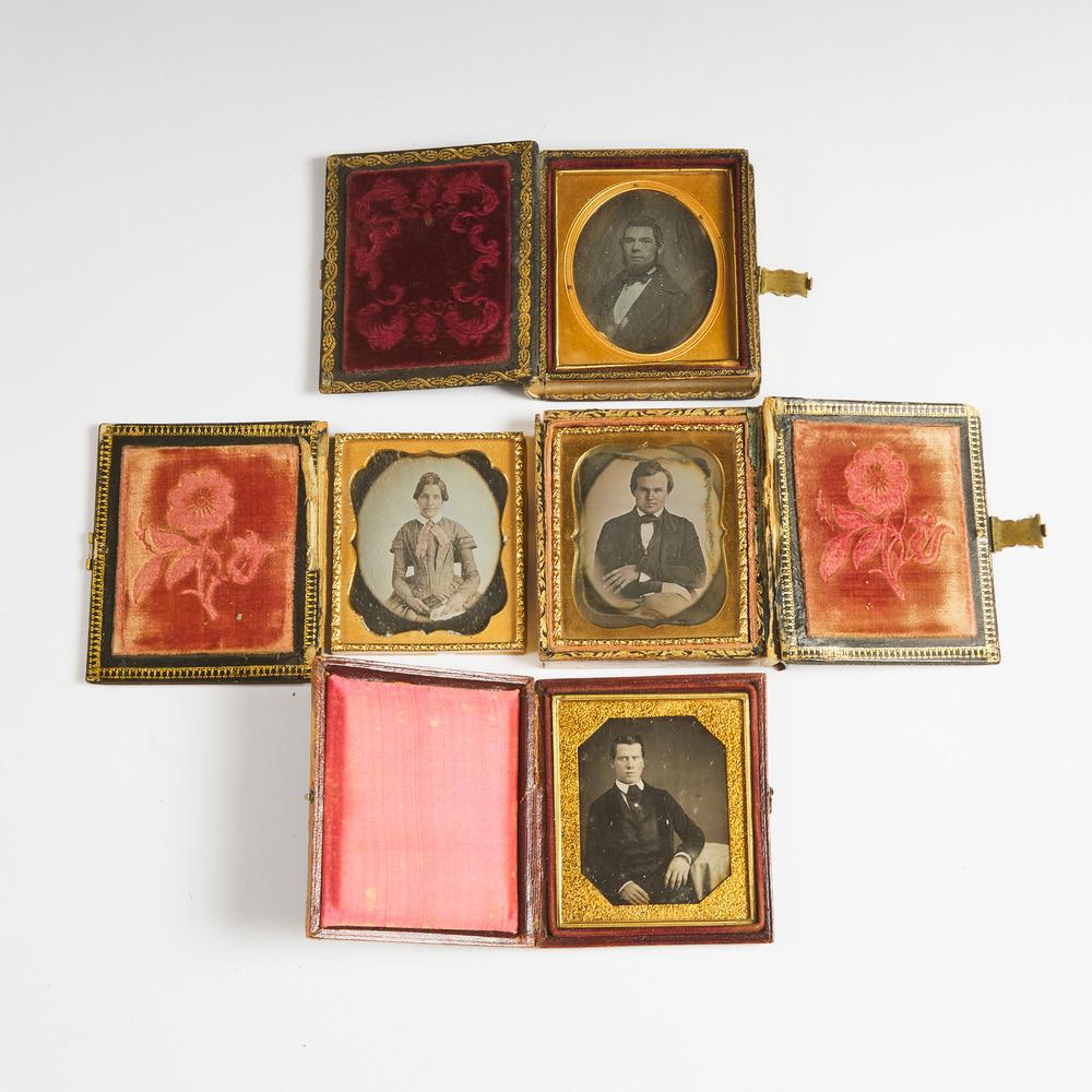 each a sixth plate daguerreotype, one in a thermoplastic Union Case, the remainder in pressed leather cases, 3.75 x 3.25 in — 9.5 x 8.3 cm