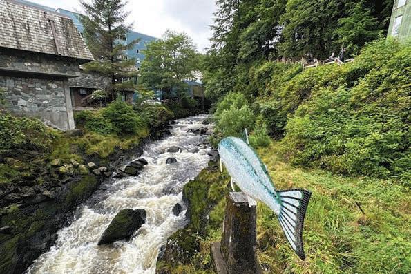 Catch the roaring waters of Ketchikan Creek (left) or pass through downtown Juneau to see huge glaciers and blooming flowers by Red Dog Saloon (right).