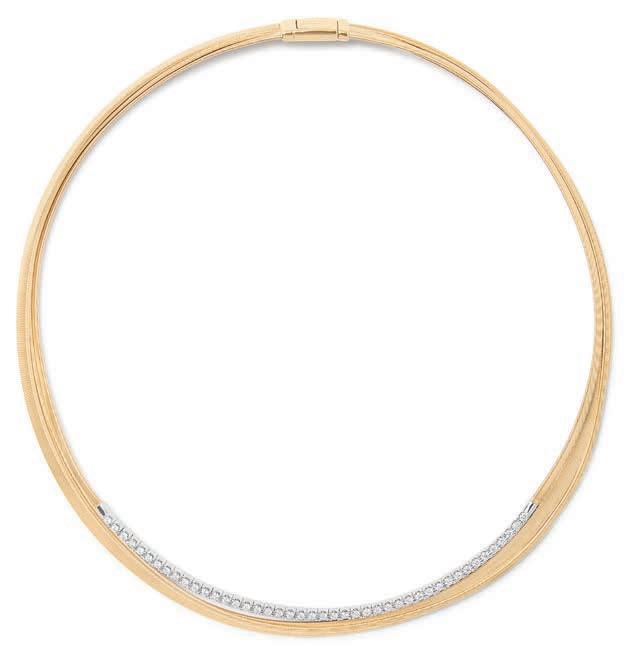 Clockwise from the top: 18K Yellow Gold 5-Strand Collar with Diamonds, $37,550; 18K Yellow Gold Collar with Diamonds, $16,900; 18K Yellow Gold Pendant Necklace with Diamonds $6,250; 18K Yellow Gold Drop Earrings with Diamonds $8,950; 18K Yellow Gold Coil and Diamond Huggie Earrings $6,650; 18K Yellow Gold Coil and Diamonds Large Bangle