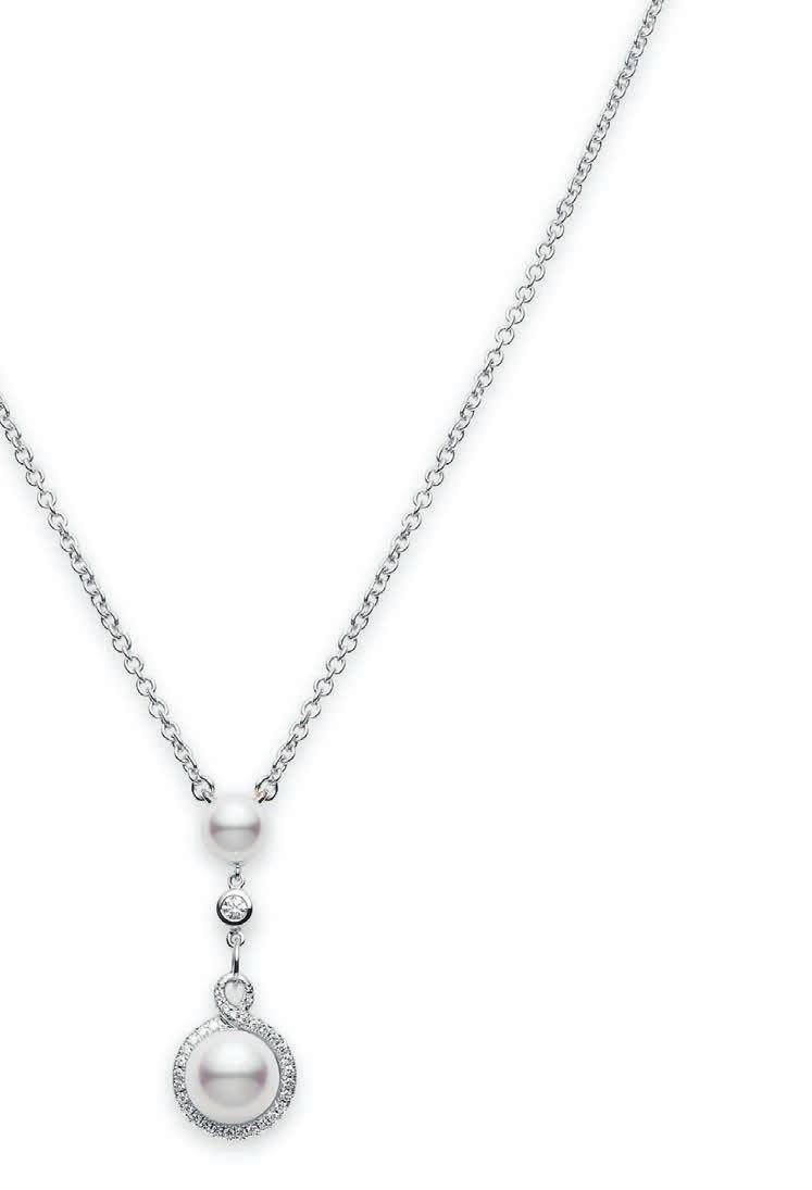 Clockwise from top right: Akoya cultured pearl and diamond earrings set in 18K white gold, $8,300; Black South Sea cultured pearl and diamond earrings set in 18K white gold, $8,000; Black South Sea, Akoya cultured pearl and diamond earrings set in 18K white gold, $7,400; Akoya cultured pearl and diamond pendant set in 18K white gold, $6,300; Black South Sea, Akoya cultured pearl and diamond pendant set in 18K white gold, $6,300.
