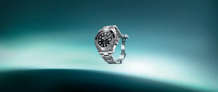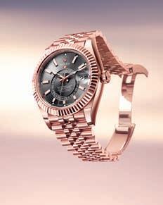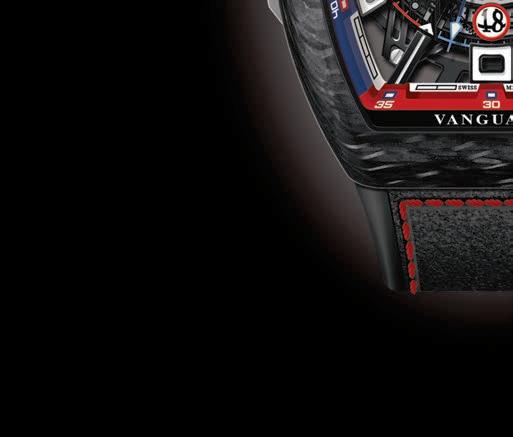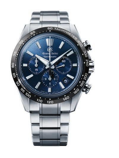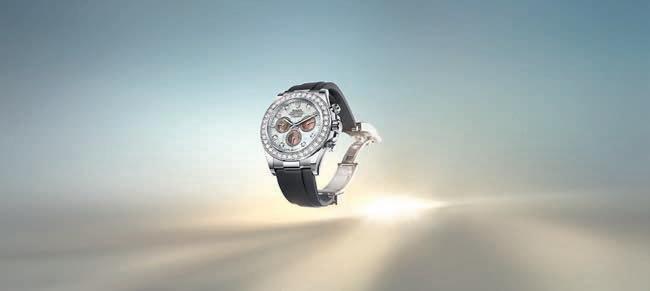 dodecagonal (12-sided) bezel with pushers that follow the sharply drawn lines of the case and a screw-down crown emblazoned with the star emblem. The Defy Skyline Chronograph’s dial is available in metallic black, blue or silver, all featuring a starry-sky pattern with engraved, fourpointed stars in the traditional El Primero dial configuration. Its three slightly oversized and overlapping counters show the elapsed seconds and minutes of the chronograph, as well as the constant running seconds. The date window—matching the color of the dial—is positioned at 4:30. The flange ring with the 1/10th-of-a-second scale has 12 facets, like its bezel, which serve as extensions of the hour markers. Presented on a threelink, stainless-steel bracelet, each watch also comes with a star-patterned rubber strap in blue, green or black, depending on your choice of dial. A quick-change mechanism allows the wearer to go from bracelet to strap with the simple push of a button.