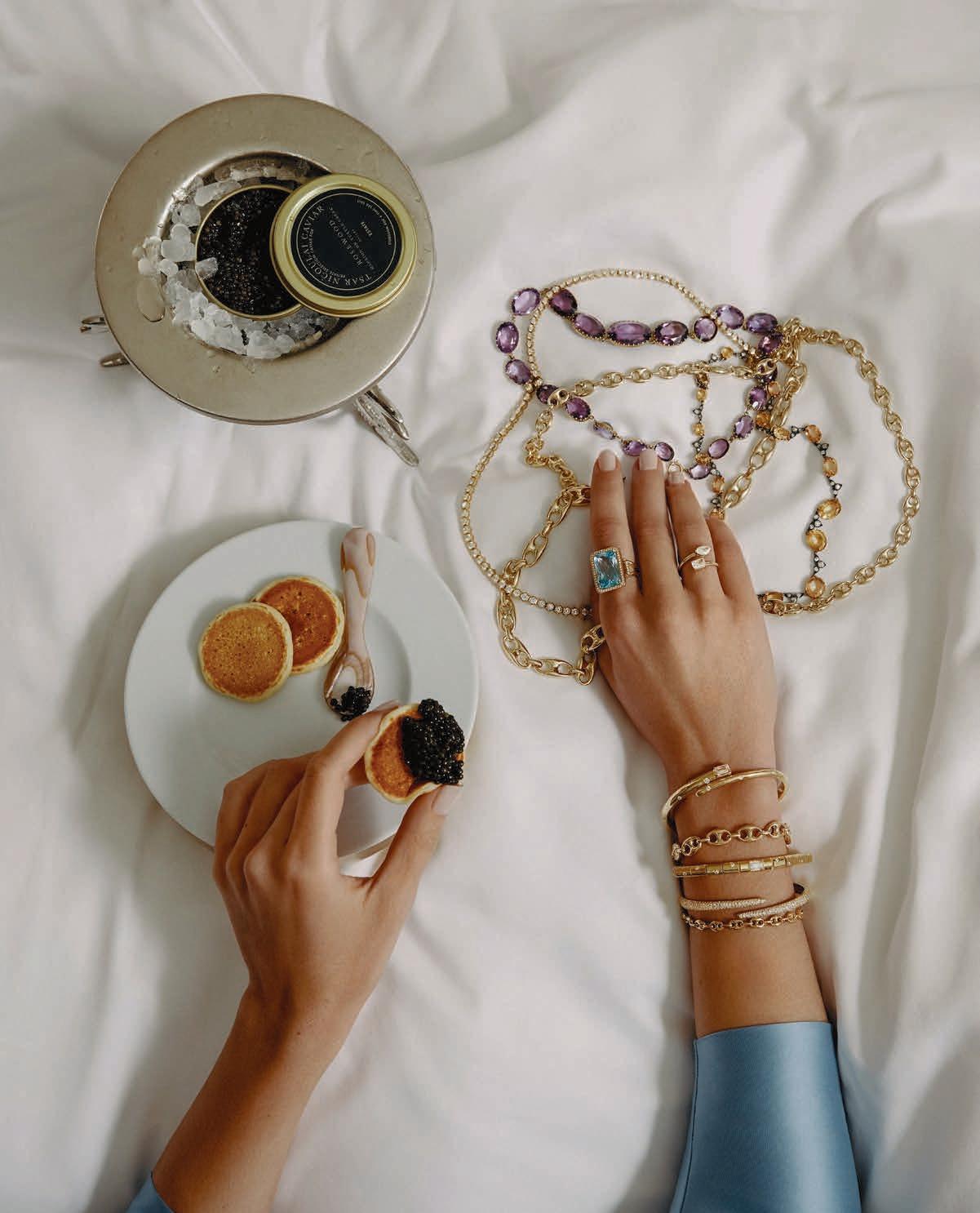 Indulgence redefined. A symphony of gold and gemstones adorns this moment of pure luxury. Kwiat’s Cobblestone collection, a dazzling trio of yellow gold and diamonds, graces the wrist, while a pair of 14K yellow gold anchor link bracelets add a touch of laid-back opulence. Fingers are adorned with a captivating Doves sky blue topaz ring and a radiant Nader Kash two-stone diamond ring. As if by magic, a collection of exquisite necklaces—Fred Leighton’s amethyst and topaz rivières, and two 14K yellow gold anchor link chains— lie scattered nearby, inviting a touch of regal splendor.
