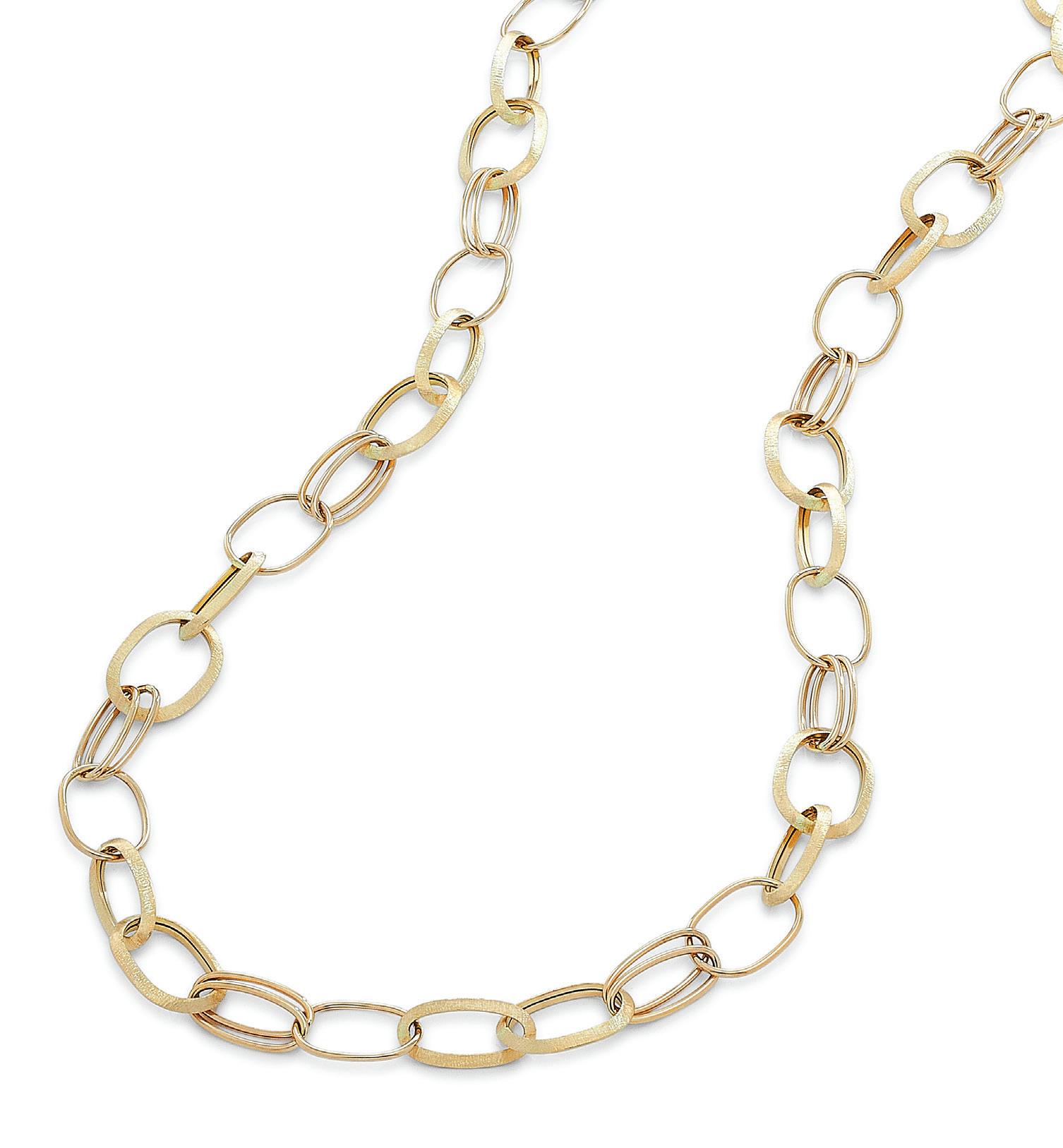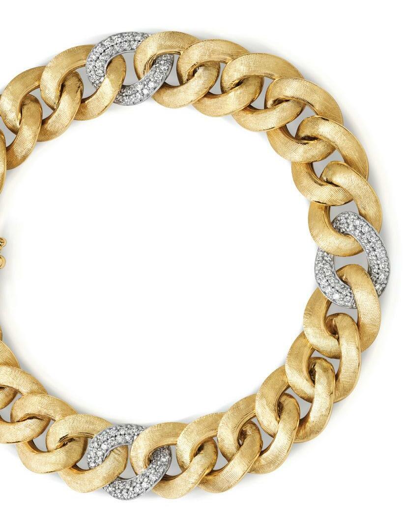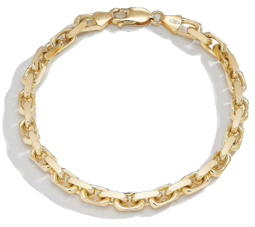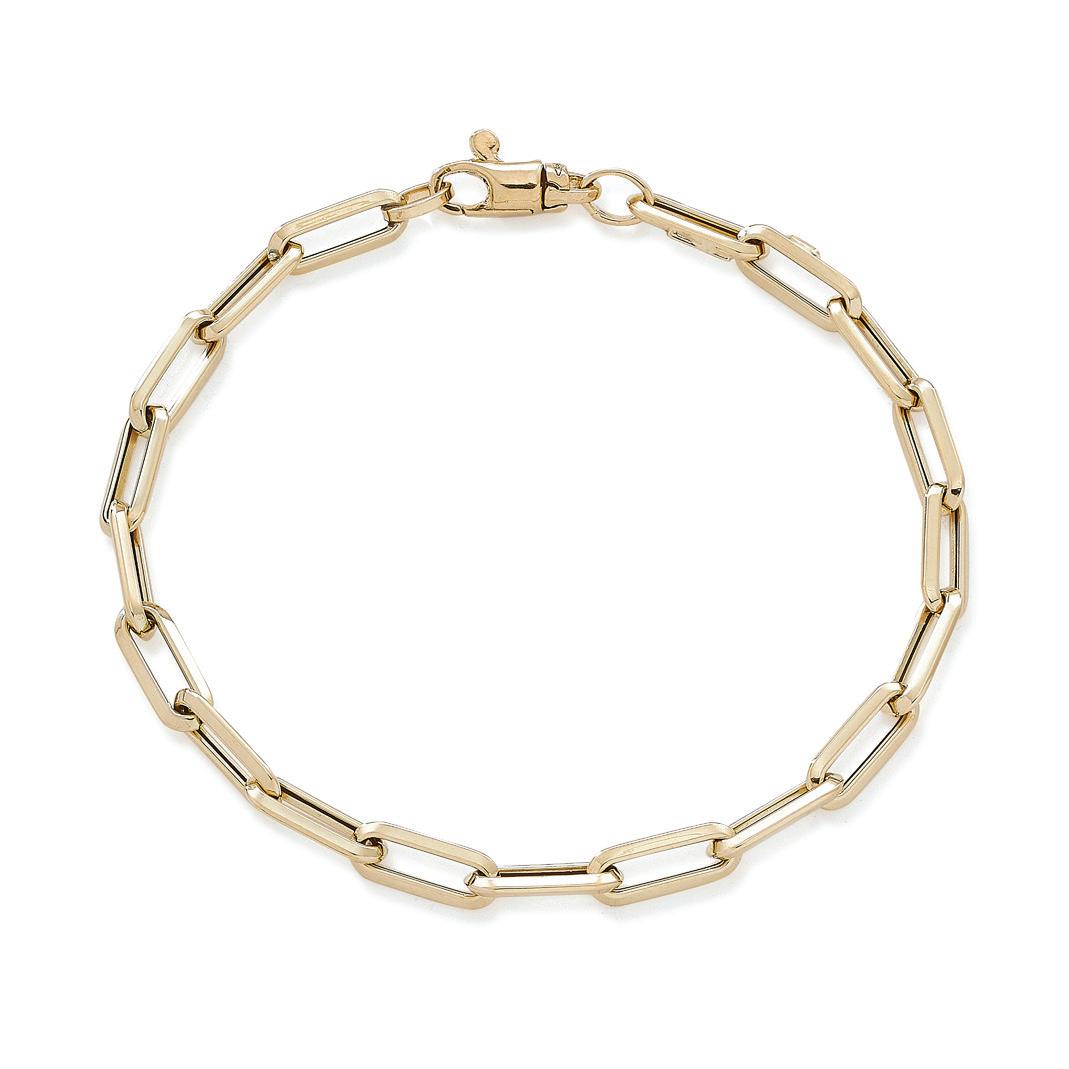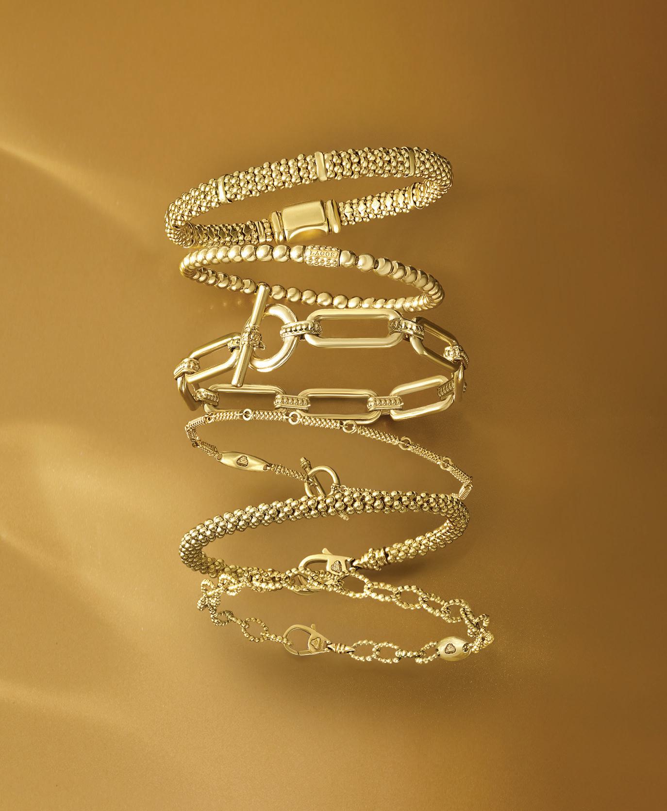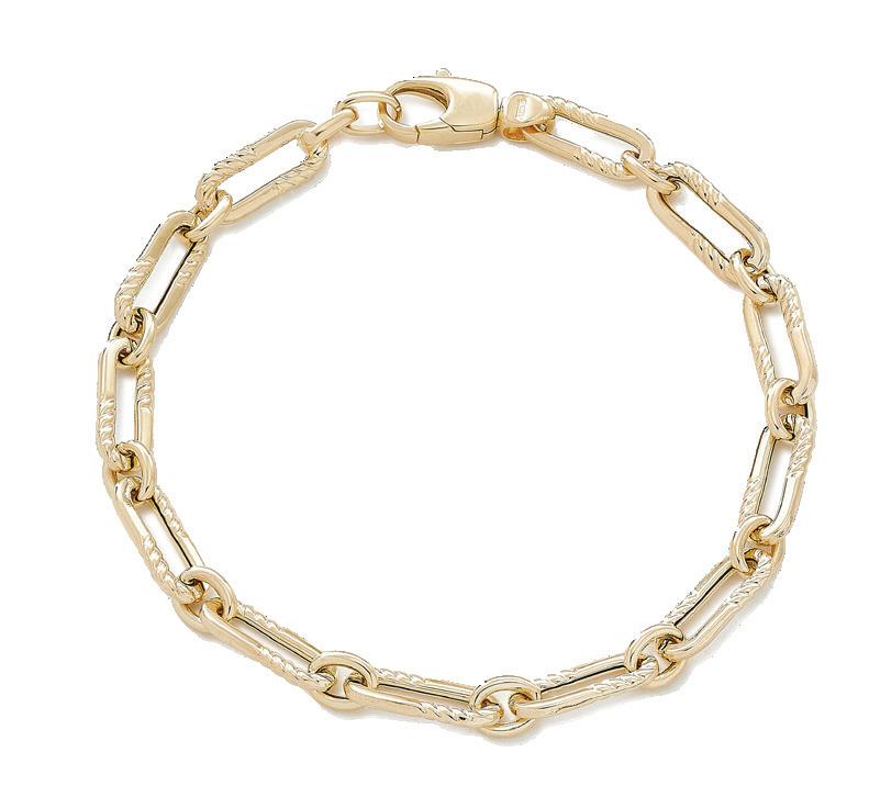 A. Box chain bracelet, $775. B. Oval link bracelet, $1,075. C. Bead station necklace, $225. D. Bar and bead station necklace, $350. E. Paperclip link bracelet, $595.