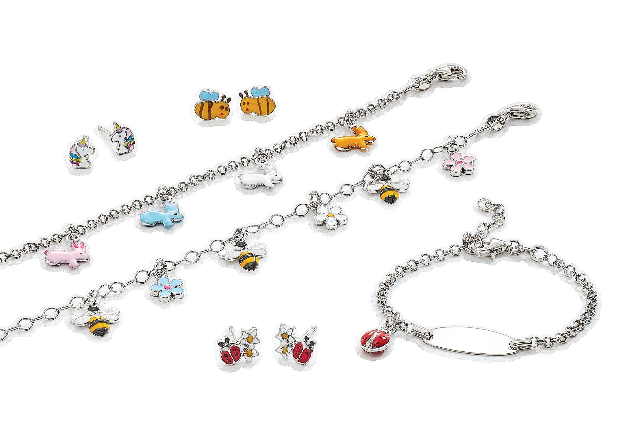 A. Pink slipper stud earrings, $20. B. Snail stud earrings, $20. C. Christmas charm bracelet, $35. D. Unicorn stud earrings, $20. E. Bee stud earrings, $20. F. Bunny charm bracelet, $45. G. Bee and flower charm bracelet, $50. H. Unicorn charm bracelet, $30. J. Rainbow charm bracelet, $30. K. Butterfly studearrings, $20. L. Pink bunny stud earrings, $20. M. Ladybug charm bracelet, $35.N. Ladybug stud earrings, $20.