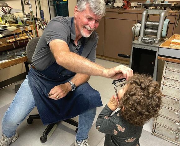 David Yurman and his wife and business partner, Sybil, visit the SCAD campus in Savannah, Georgia, to meet with the Jewelry Design program’s class of 2022. Bottom right: An exceptional student shows off a creation that used precious stones donated to the college from the Yurmans’ personal collection.