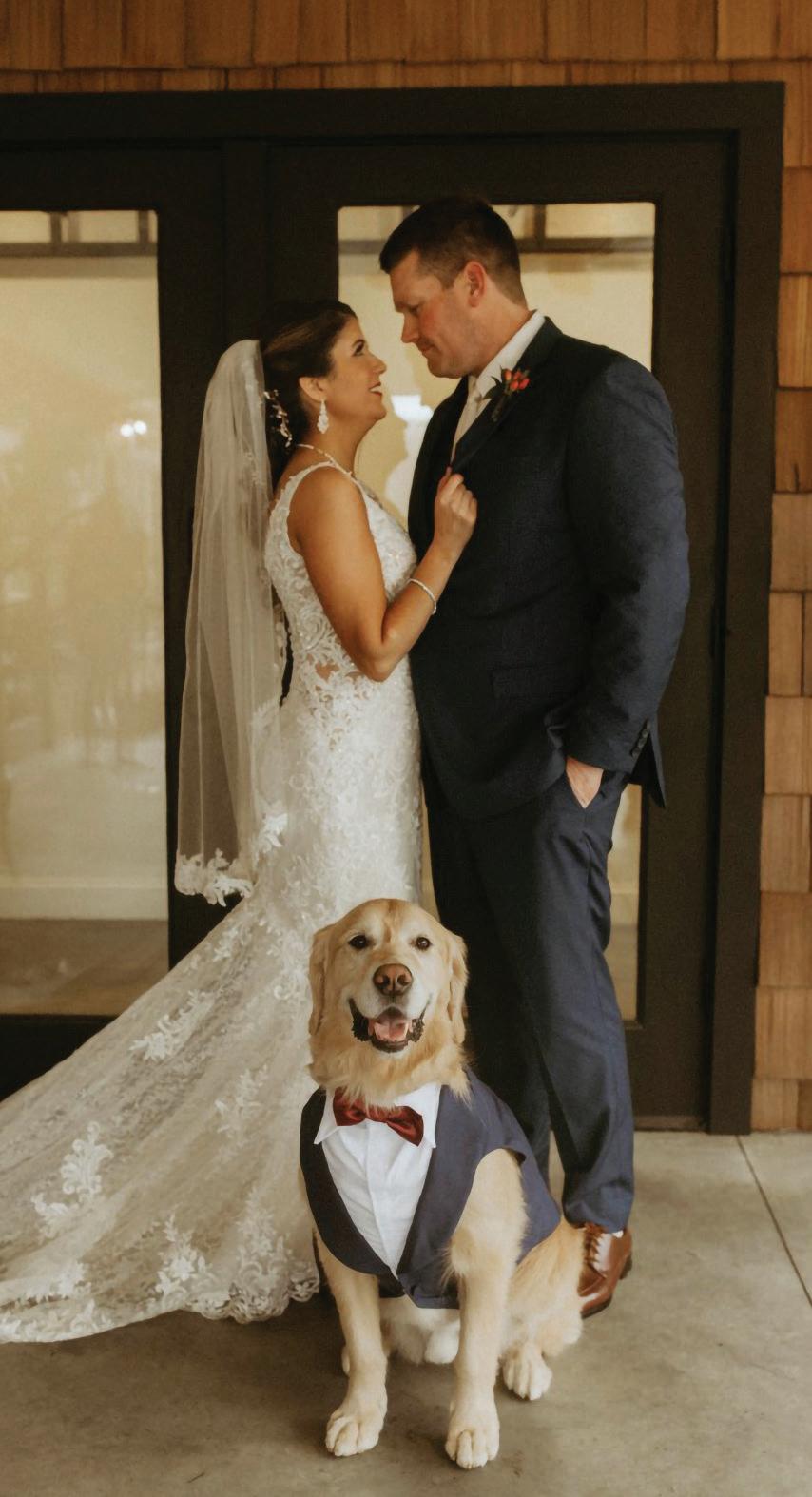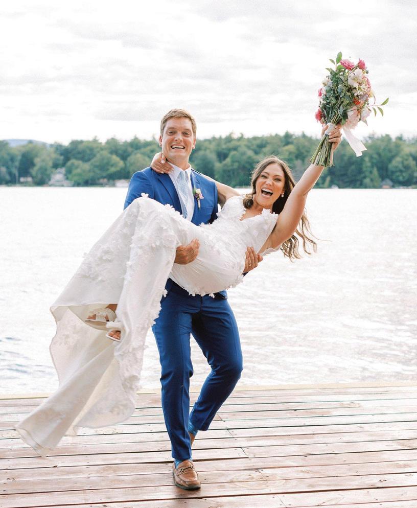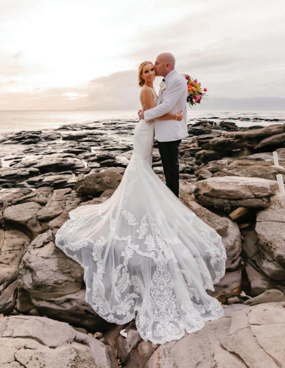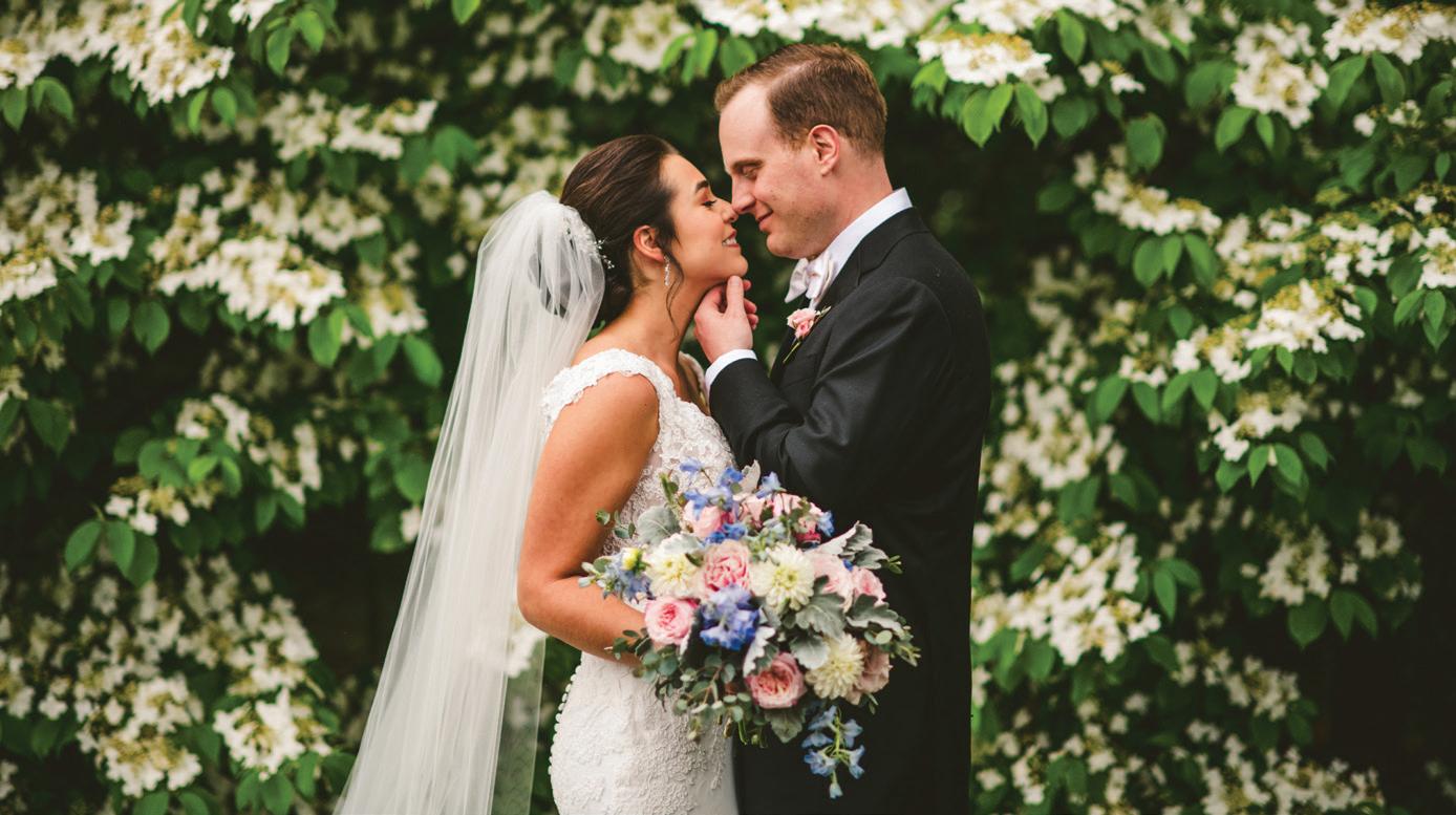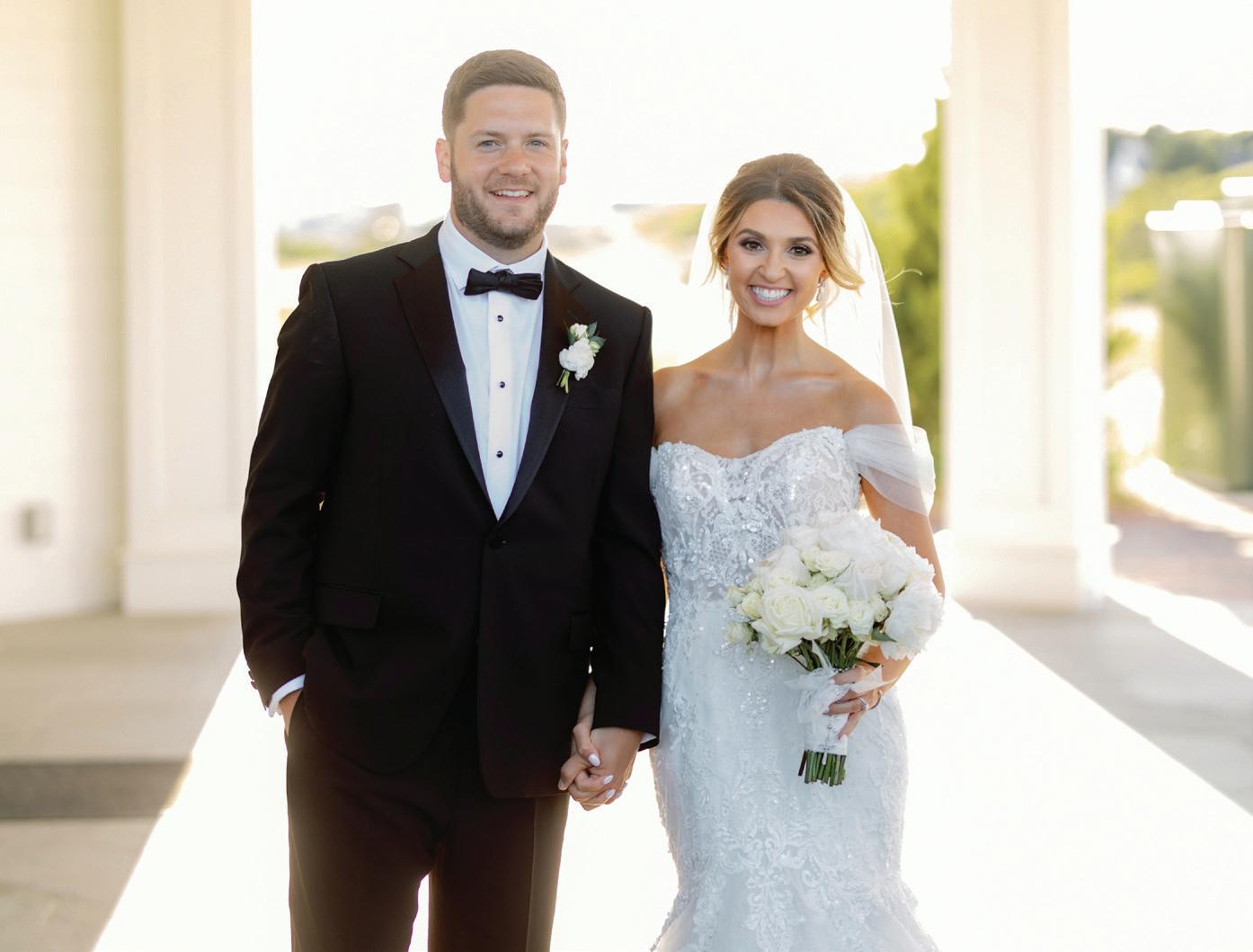 Kate and Kevin pose for photos on the lush grounds of The Club at Mediterra in Naples, Florida. Blending well with the setting, Kate’s bouquet combines white and green florals such as orchids and rose lilies.